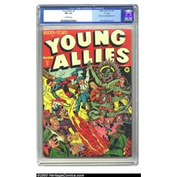 Young Allies Comics #9 "D" Copy pedigree (Timely, 1943) CGC VF+ 8.5 Off-white pages. Hitler, Tojo, and Mussolini make guest appearances on this Alex Schomburg cover, but the boys show no respect. This copy has a perfect spine and immaculate front cover, only back cover defects bring this comic down in grade. And still, this pedigree copy is only a quarter-grade away from being the highest-graded issue #9 that CGC has certified to date. Overstreet 2003 VF 8.0 value = $869; VF/NM 9.0 value = $1,235. Important notice: Heritage usually auctions material at the rate of 200-250 lots per hour. On some occasions eBay Live bid software or the Internet may not be able to keep up with the pace of the auction. We recommend placing a realistic absentee bid now as insurance to avoid disappointment. Occasionally the auctioneer may eliminate or reject an eBay Live bid, and the auctioneer may also reopen a lot after the close of the eBay live bidding (usually because we missed an audience bid), and may reject your bid even if it shows you as the winning bidder. By bidding via eBay Live, you agree that Heritage may award the lot to another bidder at its sole discretion under the circumstances described above or any other reasonable circumstances. Also please note that all Heritage lots purchased through eBay Live carry a 20% Buyer's Premium. Please make sure you read the Terms and Conditions before you bid.