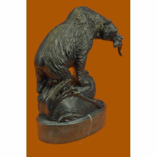 It features a young bear standing on top of a cliff leaning its weight into a rock proudly displaying his catch for the day. To this day, bears play a prominent role in the arts, mythology, and other cultural aspects of various human societies. The bear was thought to possess diplomacy equal to its great strength and it is the emblem of ferocity in the protection of kindred. A bear is also a symbol of healing and personal health, strength and bravery. Bears’ paws are also often found as crests or symbols on shields. Bronze dimensions with marble base: Height 9 X Width 8 inches. Weight: 7 lbs.