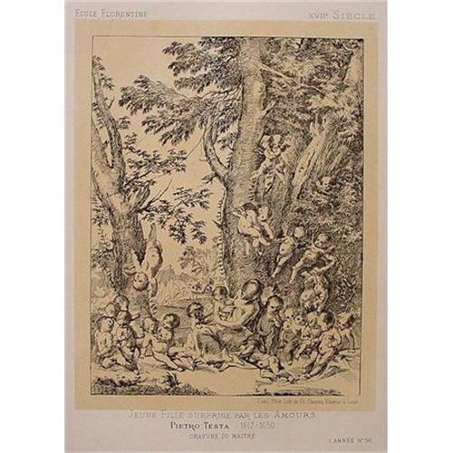 "Young Girl surprised by Cherubs" Print. Text printed on page reads as follows: "Ecole Florentine, XVII Siecle, Etabl. Phot-Lith de Ch. Claesen Editeur a Liege, "Jeune Fille Surprise par les Amours," Pietro Testa, 1617-1650, Gravure du Maitre, 1 Annee No. 56." Shipping this item anywhere in the USA will cost USD$8 via registered Post Office Airmail, service is very reliable but does not offer insurance. Please ask questions, request additional photos and shipping details before bidding.