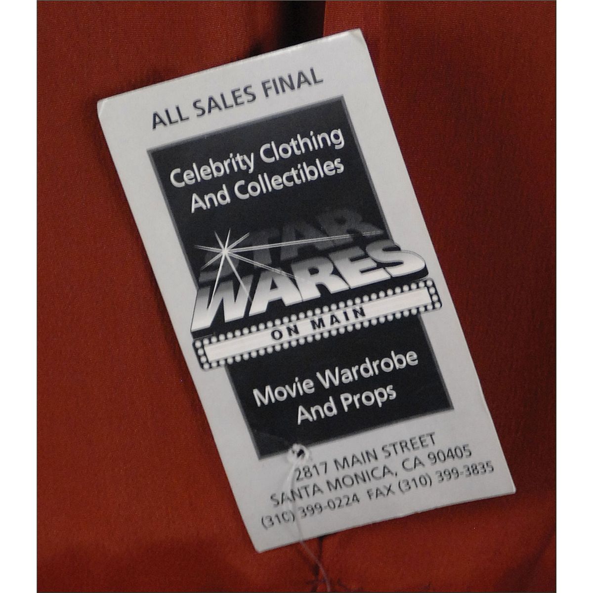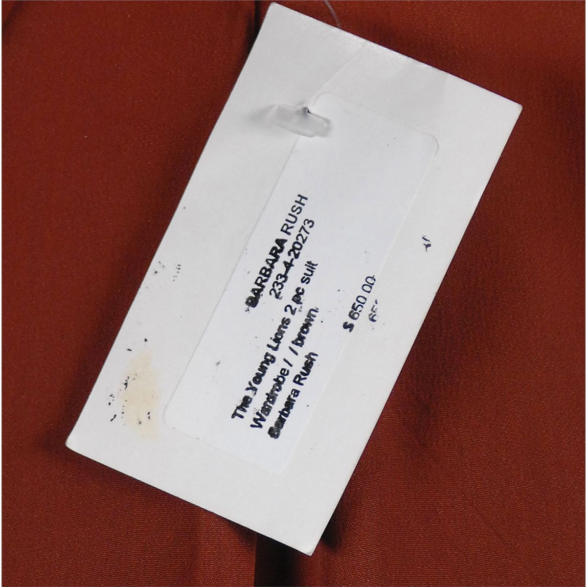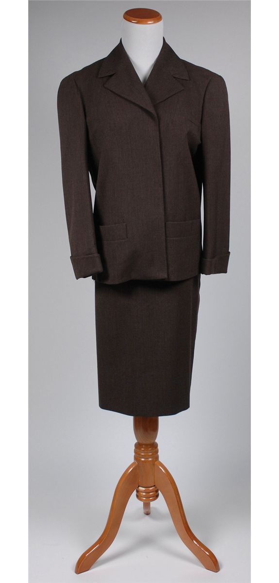 Rush’s screen-worn skirt suit from the 1958 film The Young Lions, starring Marlon Brando, Montgomery Clift, and Dean Martin. Dark brown suit consists of a single-breasted jacket with upturned cuffs, button trim on the back, and a single hook-and-eye closure. With matching brown skirt. Jacket sleeve bears a 20th Century Fox label with "Barbara Rush" and "A 798" handwritten. “798” was the Fox production number for the film. Worn in the scene where Dean Martin has a drink with her at a bar. In fine condition. Previously sold at ‘Star Wares’ in L.A., the interior of the jacket still bears a hanging tag from the store.