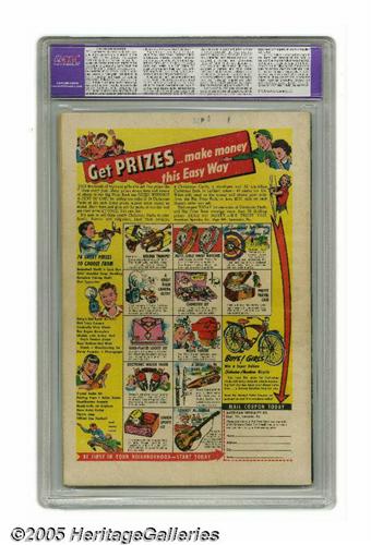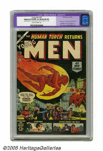 <B>Young Men #24 (Atlas, 1953) CGC Apparent VF/NM 9.0 Moderate (A) Cream to off-white pages.</B></I> This is a very significant issue in Marvel history, as it's the first comic book of the company's brief "superhero revival" period that brought back the Human Torch, Captain America, and the Sub-Mariner. The issue not only recaps the origins of all three heroes, but also explains what they had been doing for the last four years! The Torch story has great Russ Heath art, plus the shocking revelation that the Torch killed Hitler (hmm, the Fuehrer's remains were charred, after all...)! The Captain America story has John Romita Sr. art and a Red Skull appearance (this being the 1950s, he's cooperating with some "reds" of another kind), and the Sub-Mariner story has Bill Everett art, a Betty Dean appearance, and even Subby sporting a business suit! CGC notes, "Restoration includes: color touch, splits sealed, cleaned, re-glossed, reinforced." Overstreet 2005 GD 2.0 value = $292; VG 4.0 value = $584; FN 6.0 value = $876; VF 8.0 value = $1,825; VF/NM 9.0 value = $2,813.