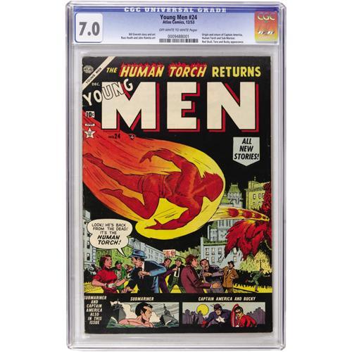<B>Young Men #24 (Atlas, 1953) CGC FN/VF 7.0 Off-white to white pages.</B></I> Should <I>this</B></I> be considered the first Silver Age comic book? One funnybook expert whose opinion we respect made that claim recently, and we see where he's coming from... and for that matter, why should the revival of one of DC's third-or fourth-best Golden Age characters (<B>Showcase</B></I> #4) be worth ten times the revival of <I>Timely's</B></I> top three characters? All in all, this first comic book of the "superhero revival" period seems undervalued to us. The Human Torch, Captain America, and the Sub-Mariner all made their comebacks here, drawn by Russ Heath, John Romita Sr., and Bill Everett respectively. The cover is credited to Carl Burgos. Overstreet 2006 FN 6.0 value = $888; VF 8.0 value = $1,850. CGC census 3/07: 2 in 7.0, 2 higher. <I> From the Warren Hall Collection.</B></I><BR><BR><b>Shipping:</b> Comics - Slabbed (certified) (<a target="_blank" href="http://www.heritageauctions.com/common/shipping.php">view shipping information</a>)