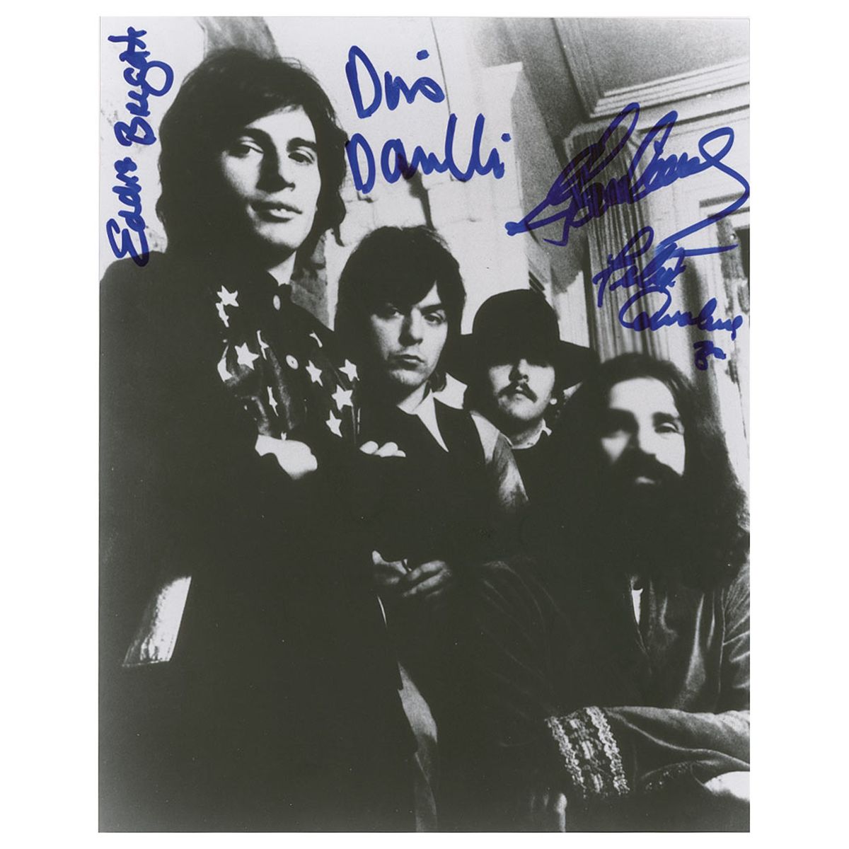 Satin-finish 8 x 10 group photo, signed in blue felt tip by Eddie Brigati, Dino Danelli, Gene Cornish, and Felix Cavaliere. In very fine condition.