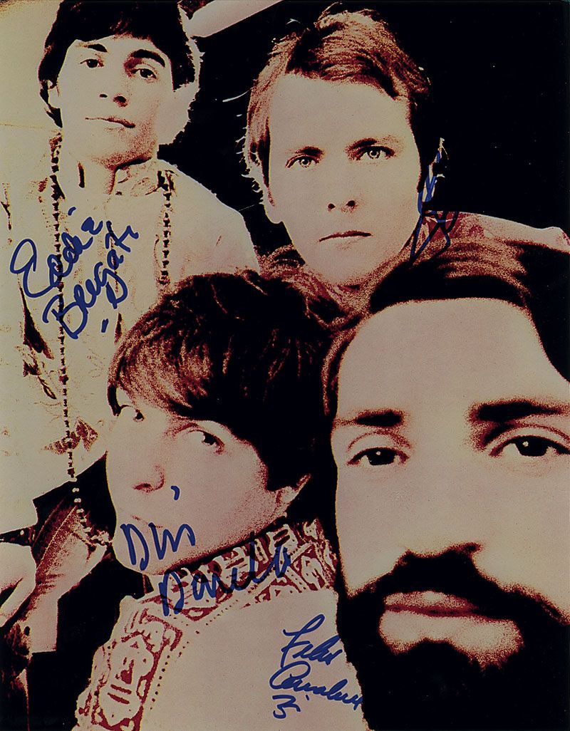 Glossy 11 x 14 group photo, signed in blue felt tip by Felix Cavaliere, Gene Cornish, Eddie Brigati, and Dino Danelli. In fine condition.