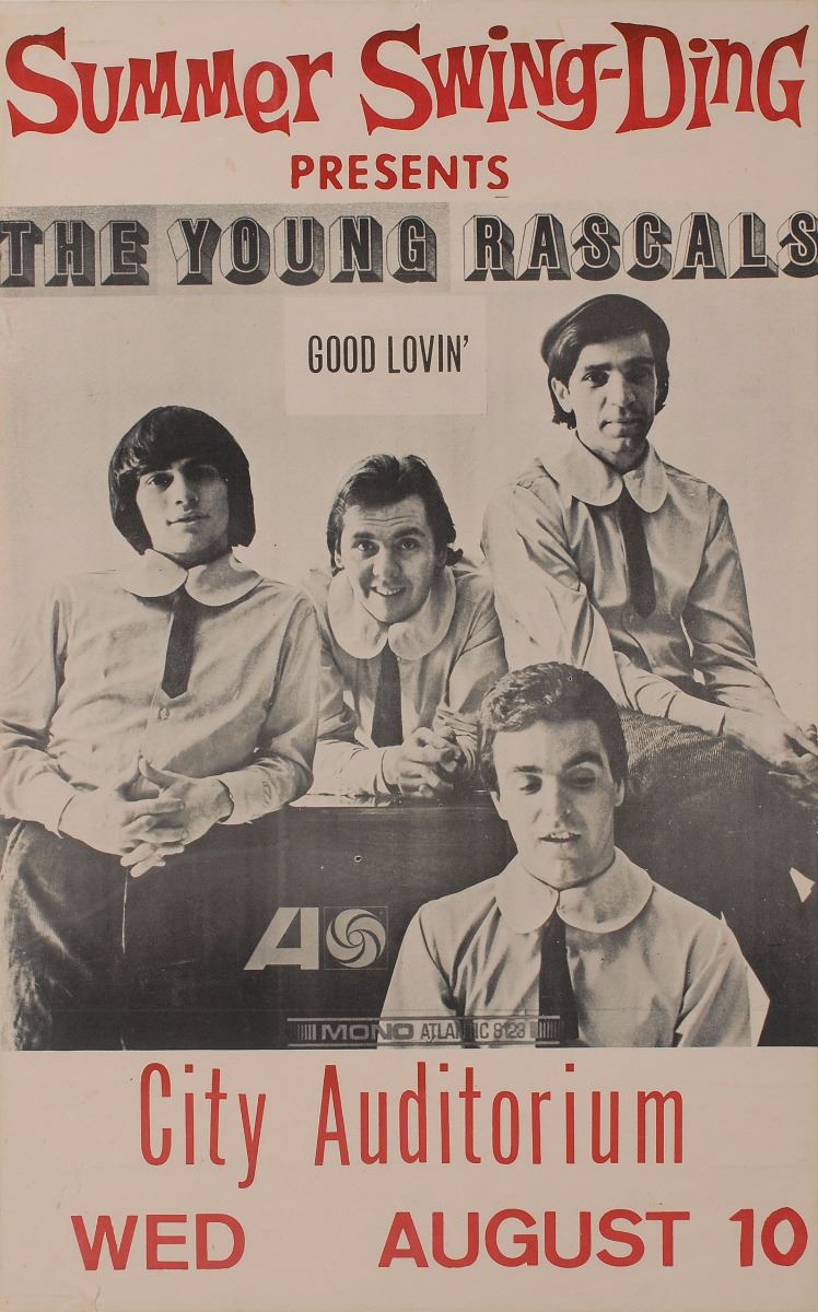 Color 10.5 x 17 poster for a Young Rascals concert presented by Summer Swing-Ding at the Colorado Springs City Auditorium on August 10 [1966], showing the album cover for the band’s self-titled full-length debut. Slight scattered soiling, some horizontal bends, and a few small tears to edges, otherwise fine condition.