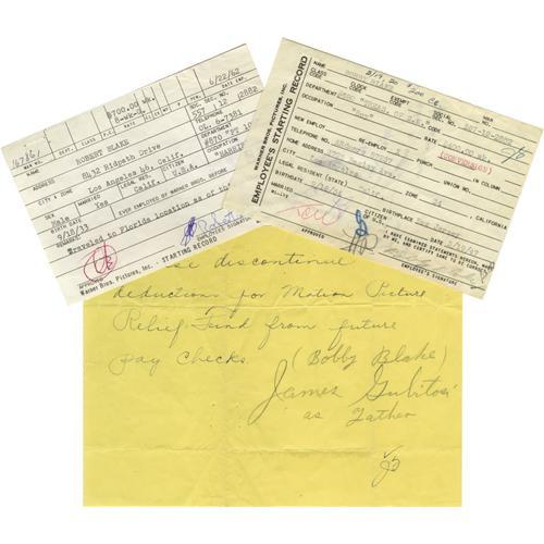 <B>Young Robert Blake Three-Document Archive, including Item from The Treasure of the Sierra Madre.</B></I> In a 60-year plus career, Emmy Award-winner Robert Blake has achieved both fame (primarily for his performance in 1967's <I>In Cold Blood</B></I>) and infamy (mainly for his acquittal for the 2001 murder of his wife, Bonnie Lee Bakley). This packet, dealing wit Blake's early career, includes a handwritten 6" x 8" note on yellow paper dated September 19, 1944, advising the studio "Please discontinue deductions for Motion Picture Relief Fund from future pay checks," signed "Bobby Blake" in pencil with "James Gubitosi as Father" added (Blake, born Michael Gubitosi, was 10 years old at this time, and playing "Little Beaver" in Wild Bill Elliott's "Red Ryder" Westerns); a Warner Bros. 4" x 6" Employee's Starting Record form, dated March 19, 1947, for Blake's role as "Boy" in the classic <I>The Treasure of the Sierra Madre,</B></I> noting his social security number, $400 per week salary, address, birthdate and birth place, and signed in pencil "Bobby Blake;" and a 4" x 6" Warner Bros. Starting Record form, dated June 22, 1962, for Blake's role as "Harris" in <I>PT 109,</B></I> including address, $700 per week salary figure, etc., noting that Blake "traveled to Florida location as of this date" and signed in ink, "Robert Blake." Warner Bros, papers have a stamp on the verso and figures regarding compensation. These are unusual and very rare curios from an actor memorable on a variety of dramatic levels, both on and off screen. In Very Fine condition.<BR><BR><b>Shipping:</b> Flat Material, Small (<a target="_blank" href="http://www.heritageauctions.com/common/shipping.php">view shipping information</a>)