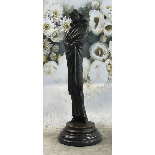The Young Girl Can Be Imagined Walking Around Her Garden In The Early Morning Sunlight Exercising Her Green Thumb. Her long jacket Wraps Around Her, Pulled Back By The Wind, As Her Eyes Face The Ground Under Her Over-Sized collar. She Was Cast Using The Ancient Method Of Lost-Wax Casting And Stained With A Brown Patina Finish For Preservation and Mounted Upon A marble Base. Dimensions: Height 17 X Width 5 inches. Weight: 9 LBS.