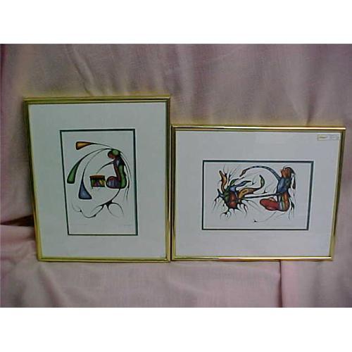 Youngfox Prints - The Drum Singer and The Duck Guardian. Professionally matted and framed in gold. One corner of the glass has a chip - prints are in excellent condition.