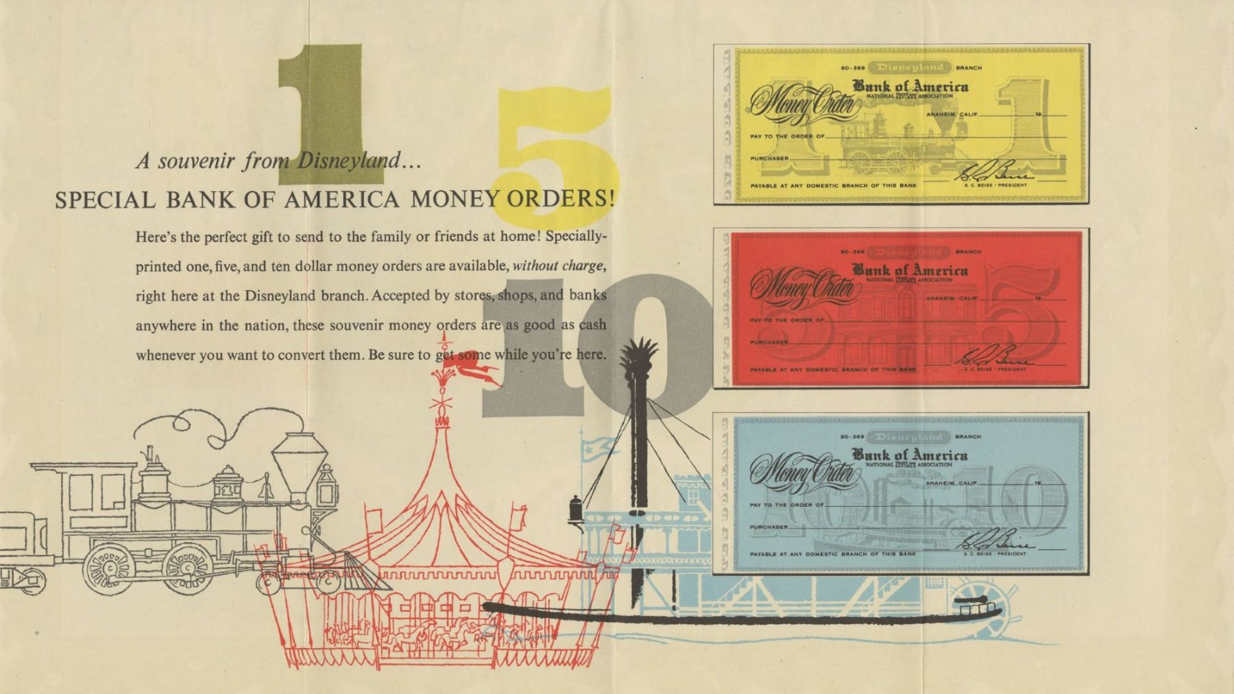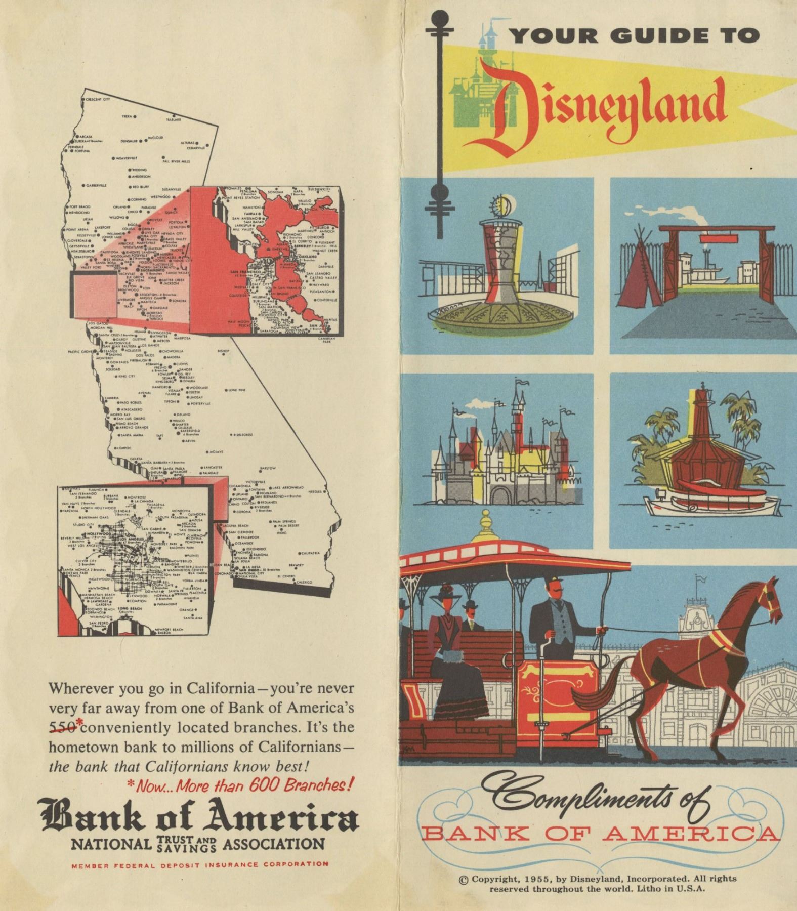 (Disneyland, 1955) An opening year brochure for Disneyland from Bank of America. This brochure features a gorgeous map of the park inside and lists the various attractions and shops. This brochure measures 9"x4" folded, and is in very good condition with little wear.
