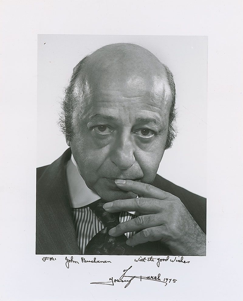 Glossy 8 x 10 portrait of the famed photographer, boldly signed and inscribed in the lower border in black ink, “For John Buchanan, with the good wishes of Yousuf Karsh, 1975.” In fine condition, with a few unobtrusive surface creases.