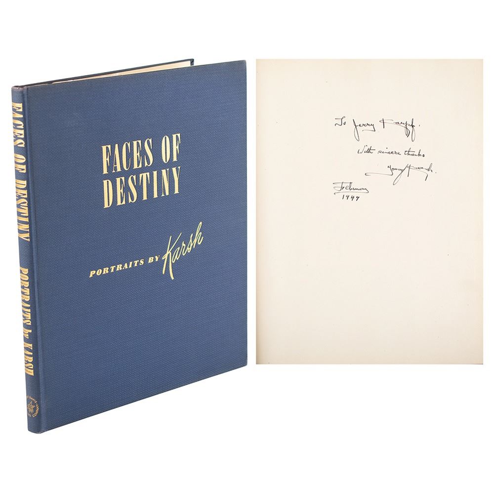 Signed book: Faces of Destiny. First edition. Chicago: Ziff-Davis Publishing Company, 1946. Hardcover, 9.25 x 11.75, 158 pages. Signed and inscribed on the first free end page in fountain pen, "To Jerry Karpf, With sincere thanks, Yousuf Karsh, February 1947." In fine condition.