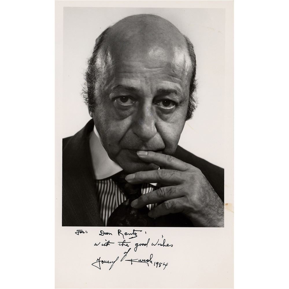 Glossy 5 x 8 silver gelatin photo of the celebrated portrait photographer, signed and inscribed in the lower border in black ink, "For: Don Rentz, with the good wishes of Yousuf Karsh, 1984." In fine condition, with a couple of faint bends and surface stains.