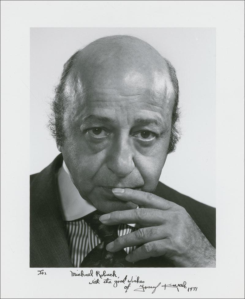Glossy 8 x 10 photo, signed and inscribed in the lower border in black ink “To Michael Robuck, with the good wishes of Yousef Karsh 1971.” In fine condition, with light chipping to emulsion along bottom edge, and a few scattered light surface marks and bends, one through facial area.