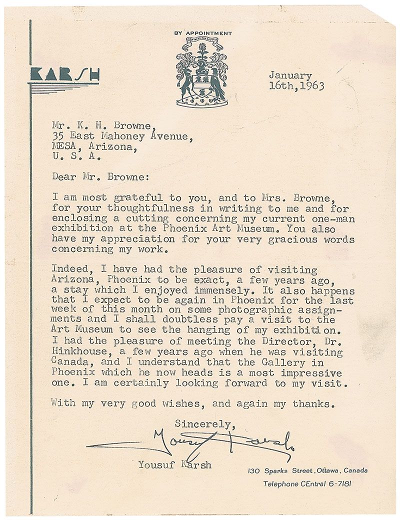 Celebrated Canadian photographer (1908–2002) best known for his portraits of the leading cultural, scientific, and political figures of his time. TLS, one page, 6.25 x 8.25, personal letterhead, January 16, 1963. Letter to an admirer. In part: “I have had the pleasure of visiting Arizona, Phoenix to be exact, a few years ago…It also happens that I expect to be again in Phoenix for the last week of this month on some photographic assignment and I shall doubtless pay a visit to the Art Museum to see the hanging of my exhibition.” In very good condition, with trimmed edges, missing top right corner tip, scattered creases, surface loss along top edge, and mounting remnants to reverse.