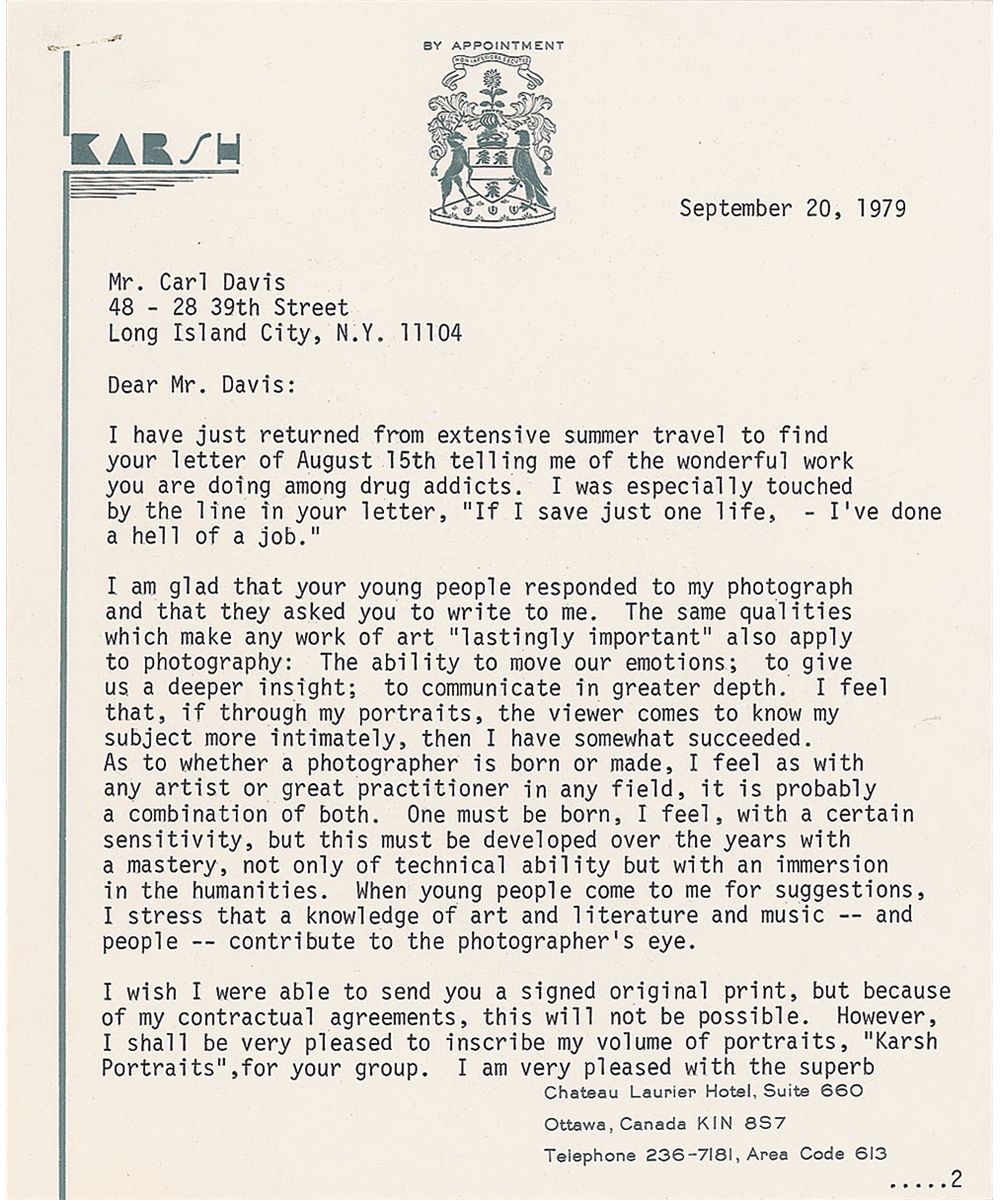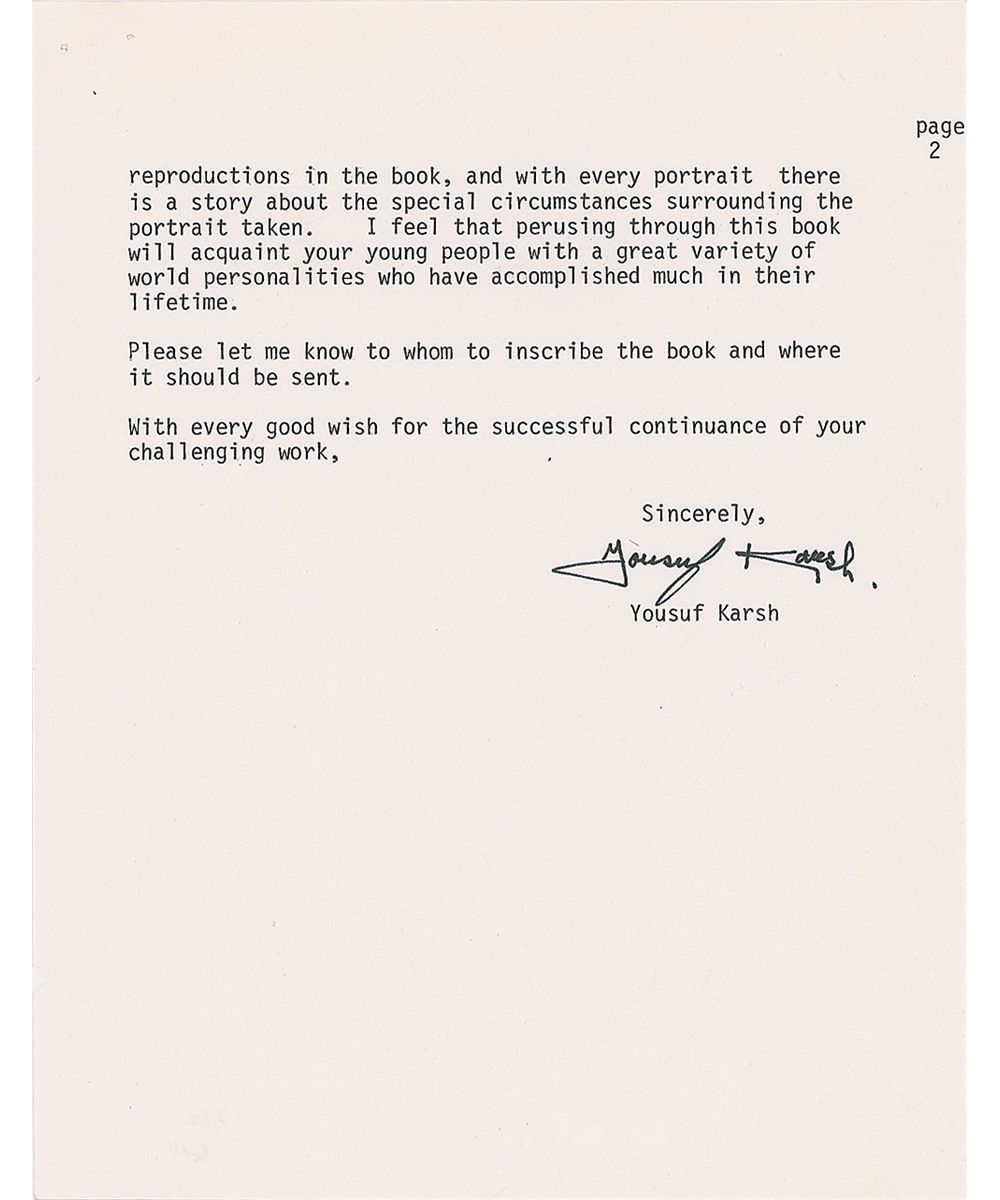 Celebrated Canadian photographer (1908–2002) best known for his portraits of the leading cultural, scientific, and political figures of his time, including Albert Einstein, Winston Churchill, and Ernest Hemingway. TLS, two pages, 6.25 x 8, Karsh letterhead, September 20, 1979. Letter to a mentor of drug addicts. In part: “I was especially touched by the line in your letter, ‘If I save just one life—I’ve done a hell of a job.’ I am glad that your young people responded to my photograph and that they asked you to write to me. The same qualities which make any work of art ‘lastingly important’ also apply to photography: the ability to move our emotions; to give us a deeper insight; to communicate in greater depth. I feel that, if through my portraits, the viewer comes to know my subject more intimately, then I have somewhat succeeded. As to whether a photographer is born or made, I feel as with any artist or great practitioner in any field, it is probably a combination of both.” In fine condition, with a staple hole to top left corner. Outstanding insight as Karsh, obviously touched by the compliments, opens up and reveals his inspiration for photography.
