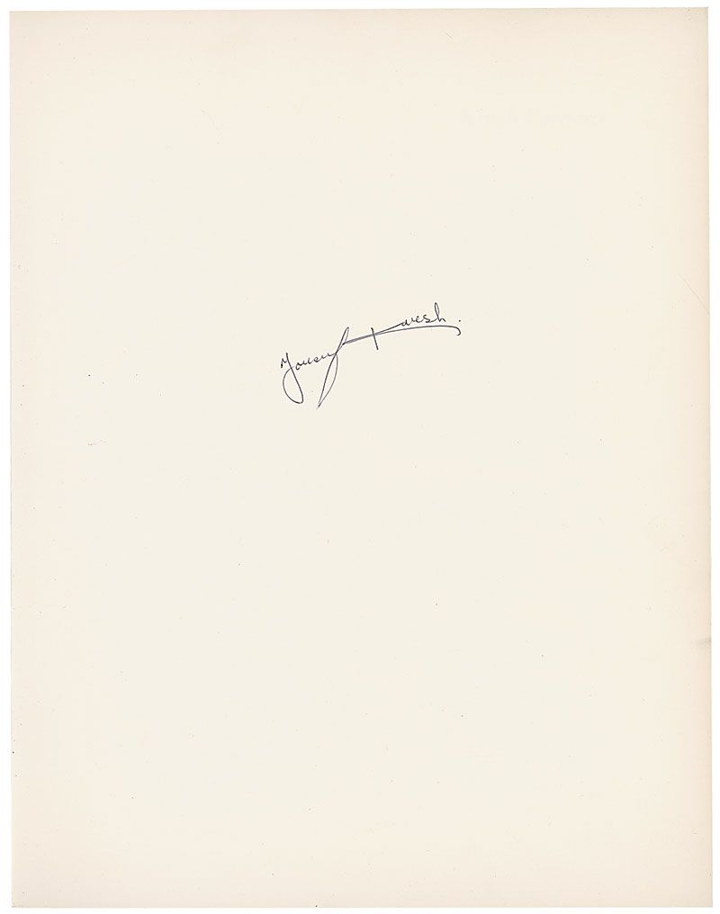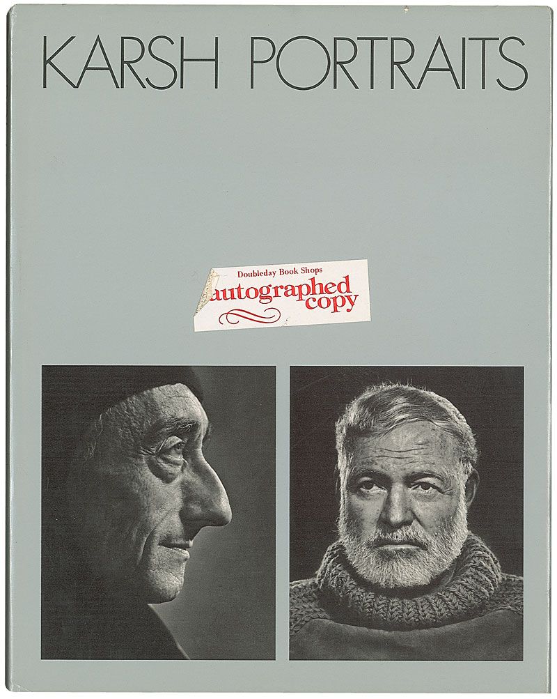 Signed book: Karsh Portraits. Later printing. Boston: New York Graphic Society, 1979. Hardcover with dust jacket, 9.75 x 12.25, 202 pages. Signed in black ink on the first free end page. In fine condition, with some creasing to dust jacket as well as a promotional label affixed to the front.