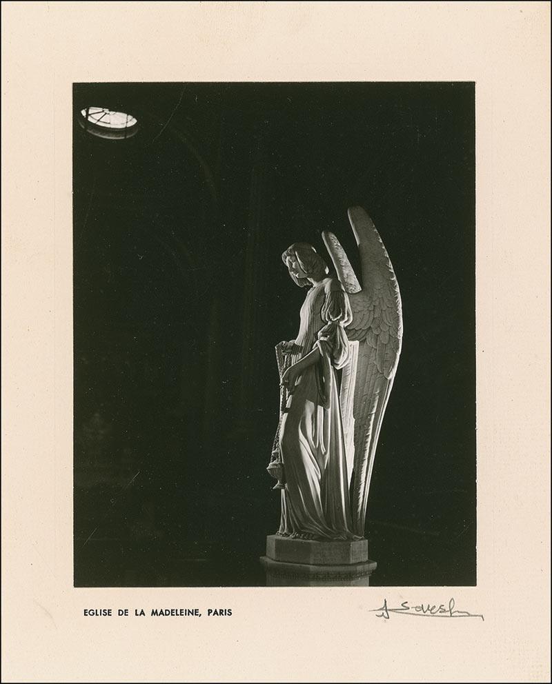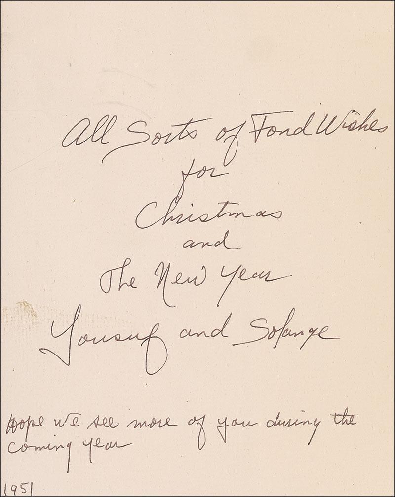 Christmas card from 1951, measuring 6 x 7.25 closed, with a 4.25 x 5.5 Karsh photo of the Eglise de la Madeline, in Paris, signed under the image in pencil by Karsh. Back cover of card bears a pre-printed Christmas wish and signatures of Yousef and Solange Karsh. In fine condition.