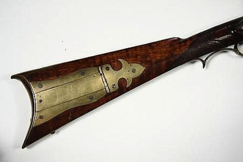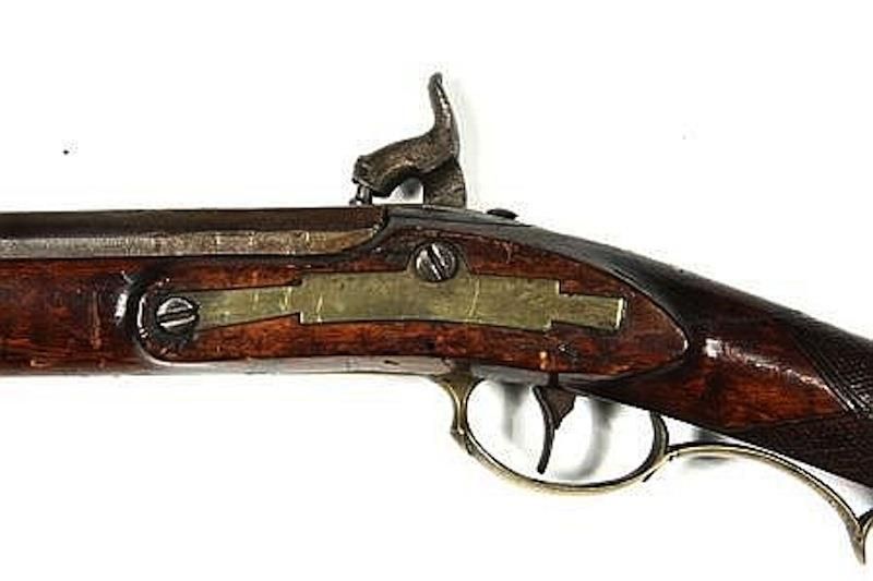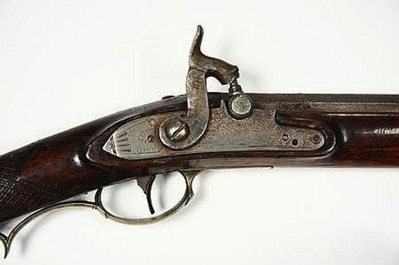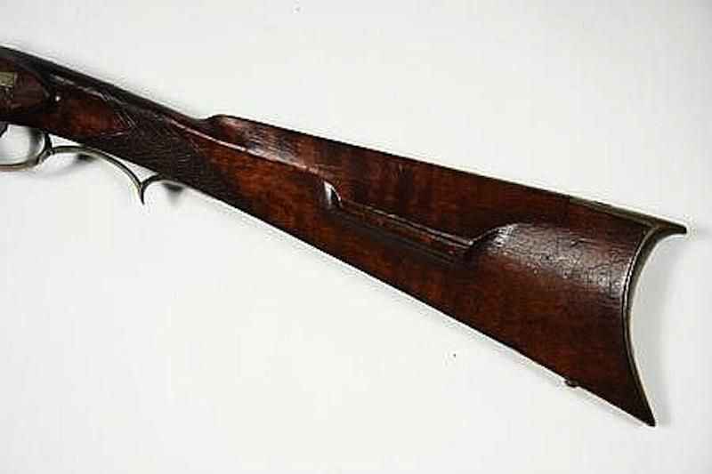 YOUTH SIZED LONG GUN - Youth Sized Percussion Long Gun with tiger maple stock, unmarked, with 33" octagonal barrel, brass fittings including longtail trigger guard, shaped patch box and butt guard, open sights. Note in patch box indicates this is a P