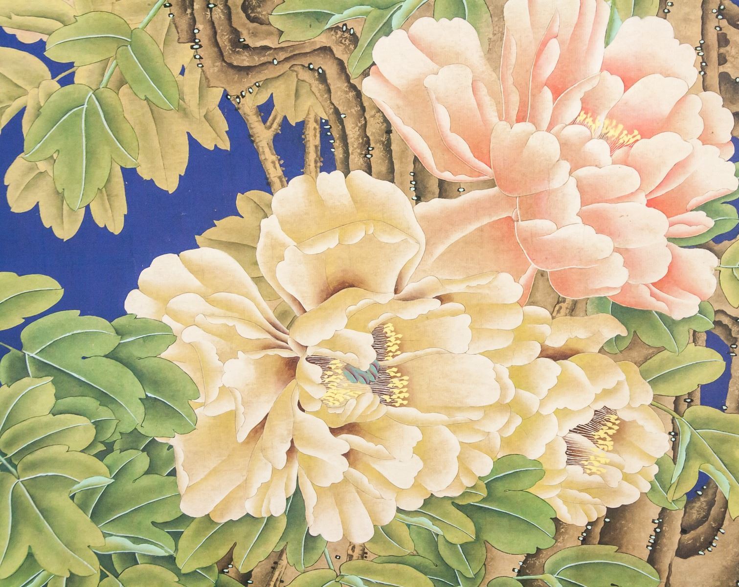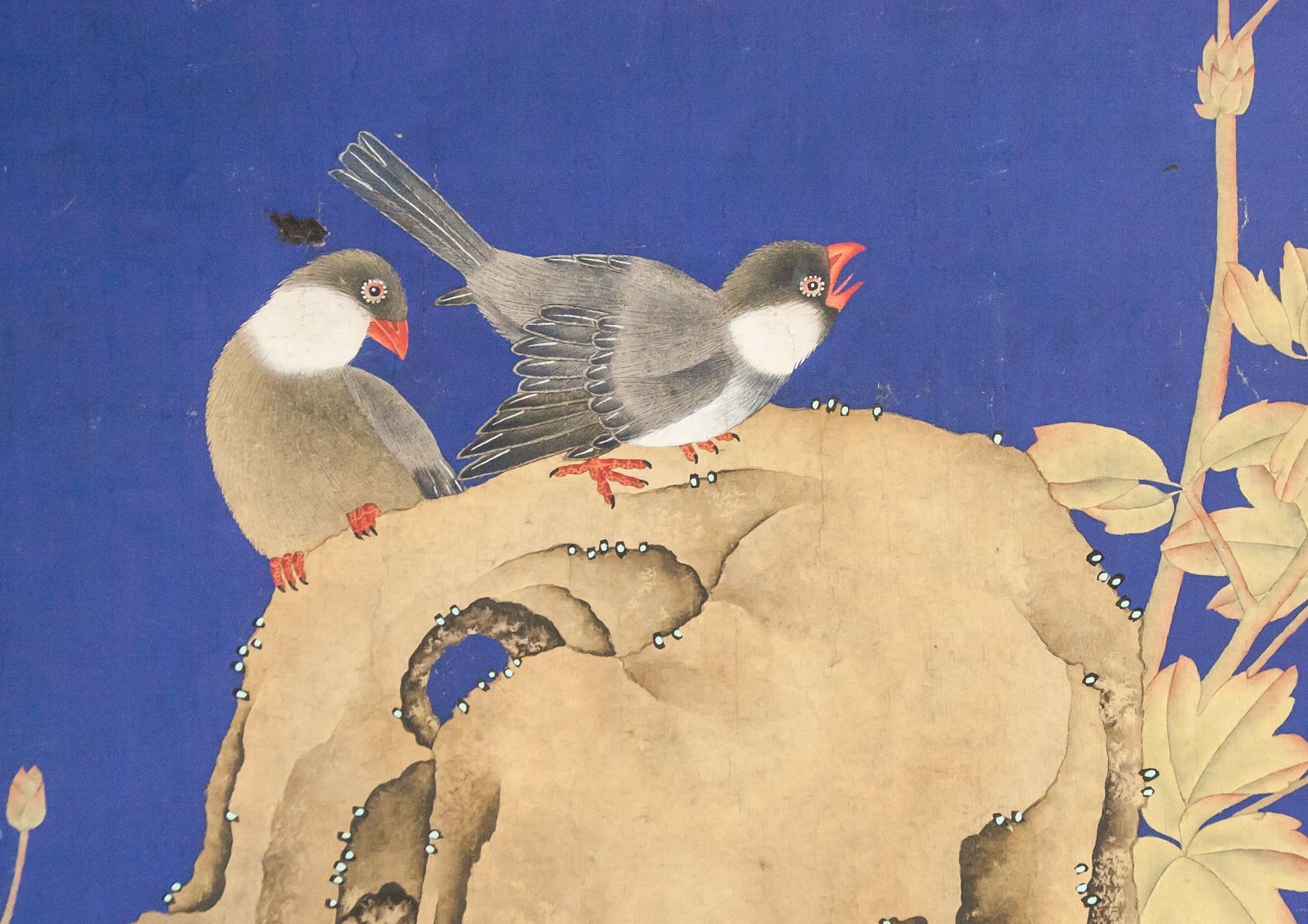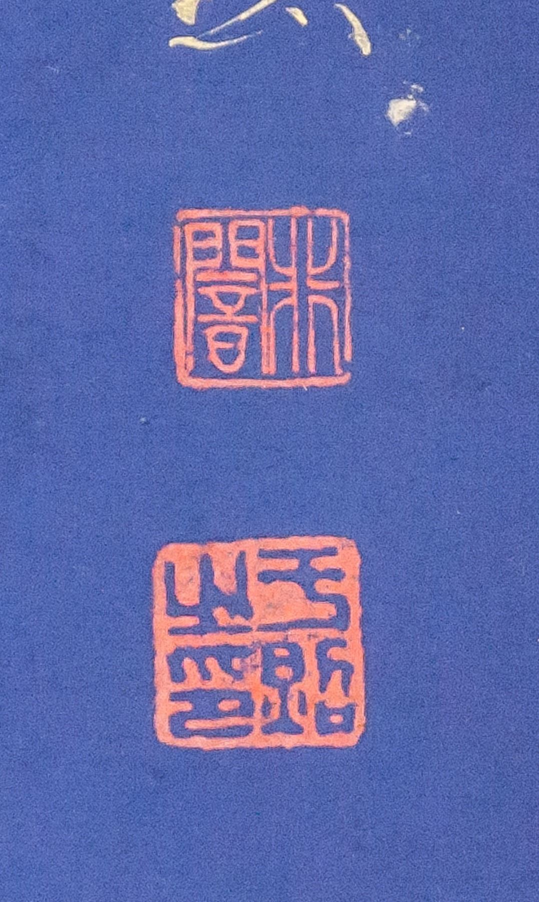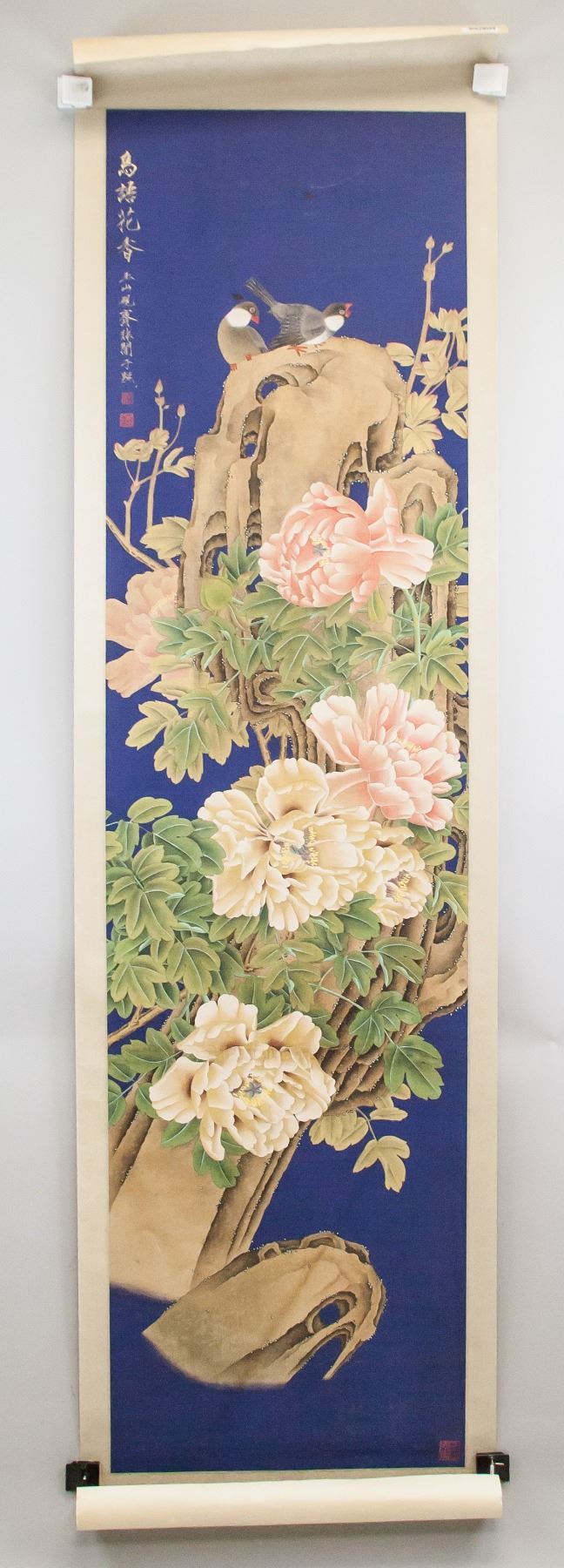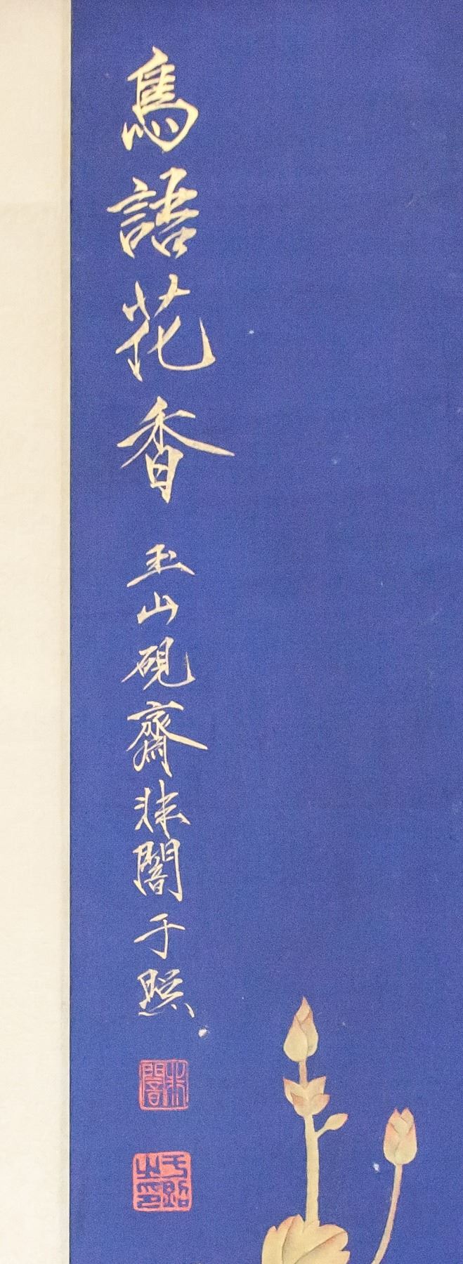 Chinese watercolor on paper scroll. Featuring images of birds and flowers against a deep blue background. Signed "Feian Yu" in Chinese characters. Inscribed with two artist stamps and one other stamp. Attributed to Yu Feian (1959- , Chinese). 173 x 44 cm