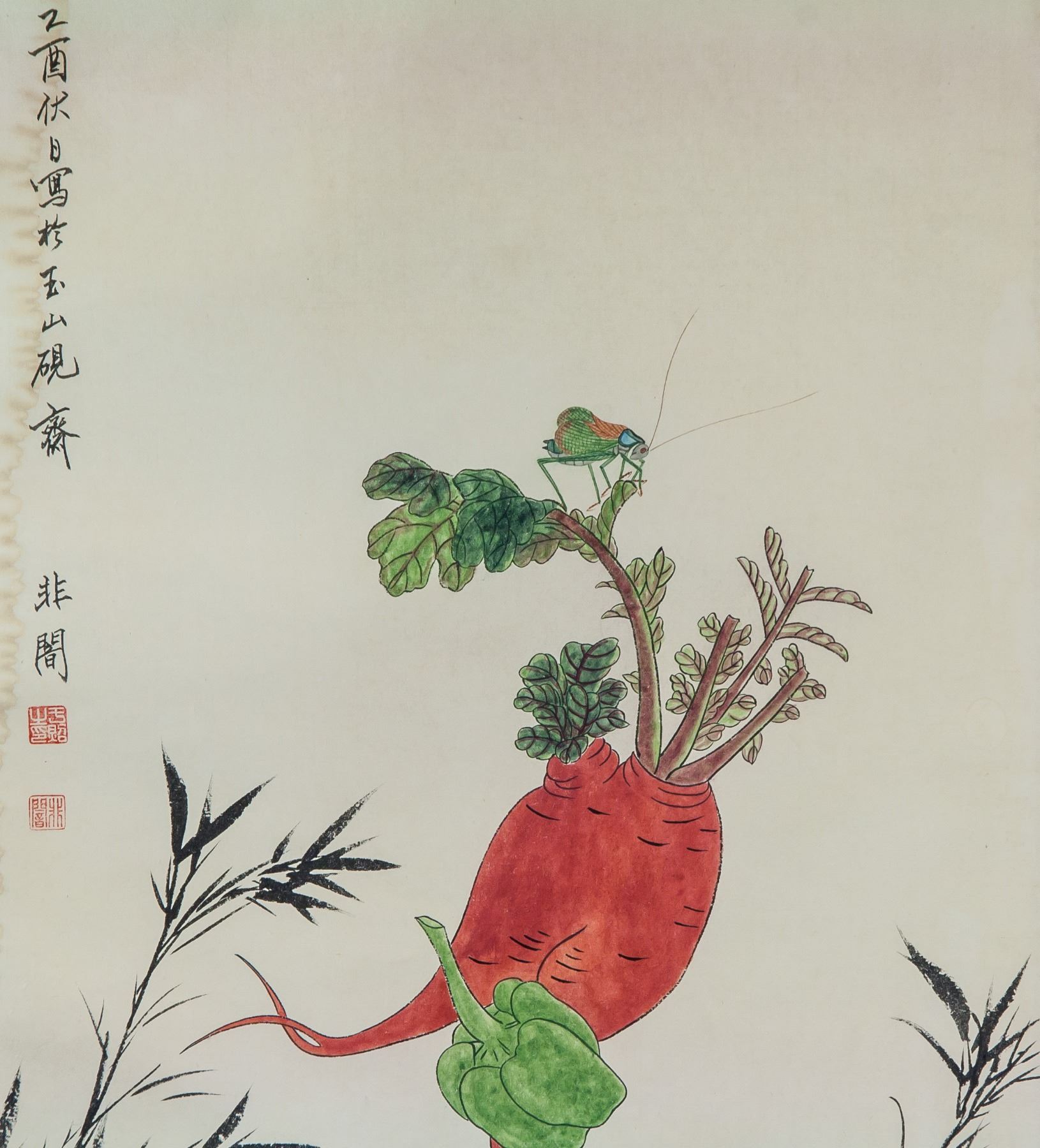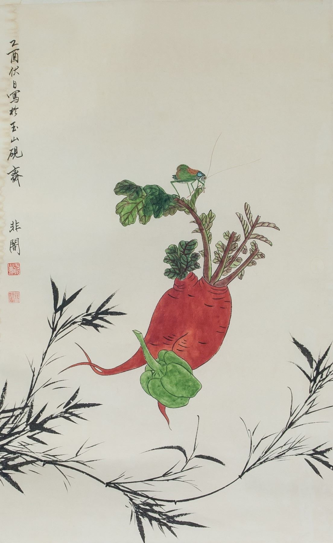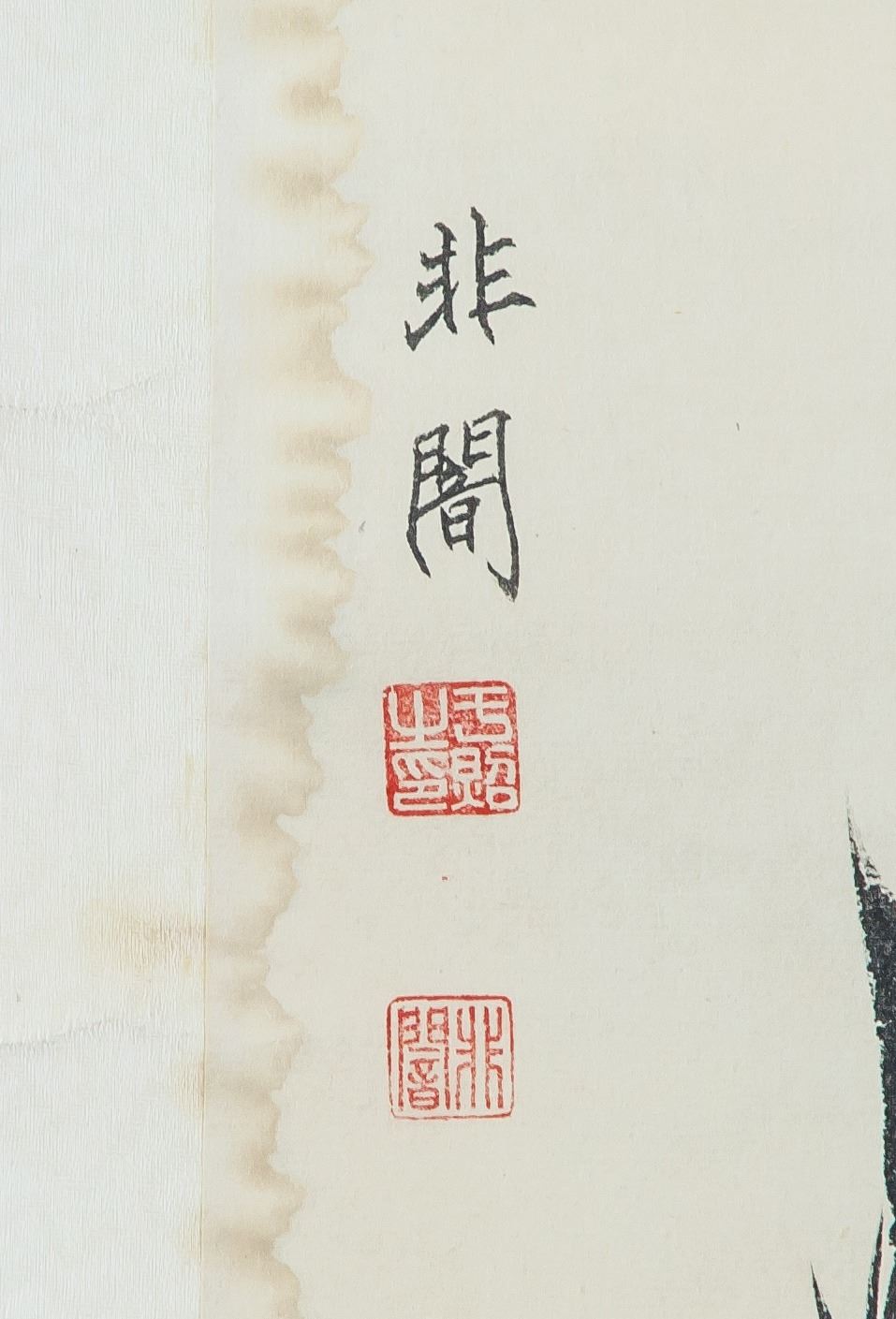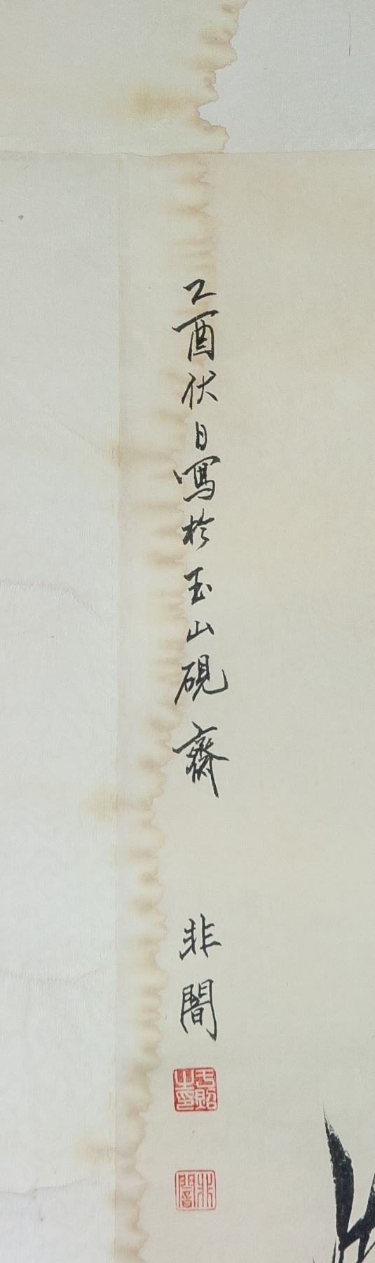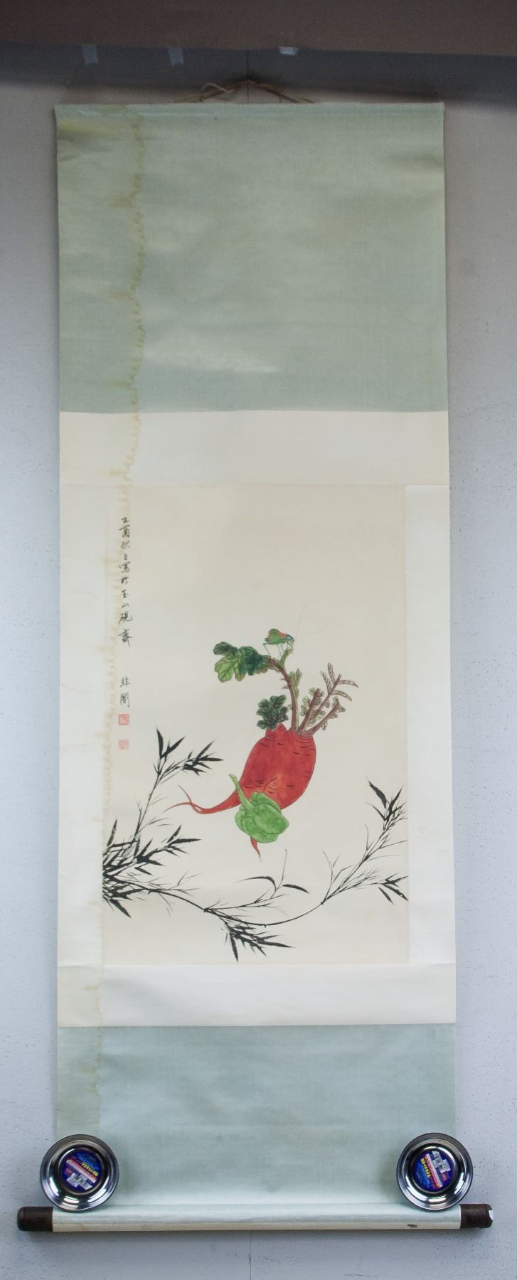 Ink and watercolor on paper, hanging scroll. Featuring a still life painting. Signed Yu Feian 1889-1959 Chinese, inscribed with 2 artist seals. With water stain. 67 x 43 cm.