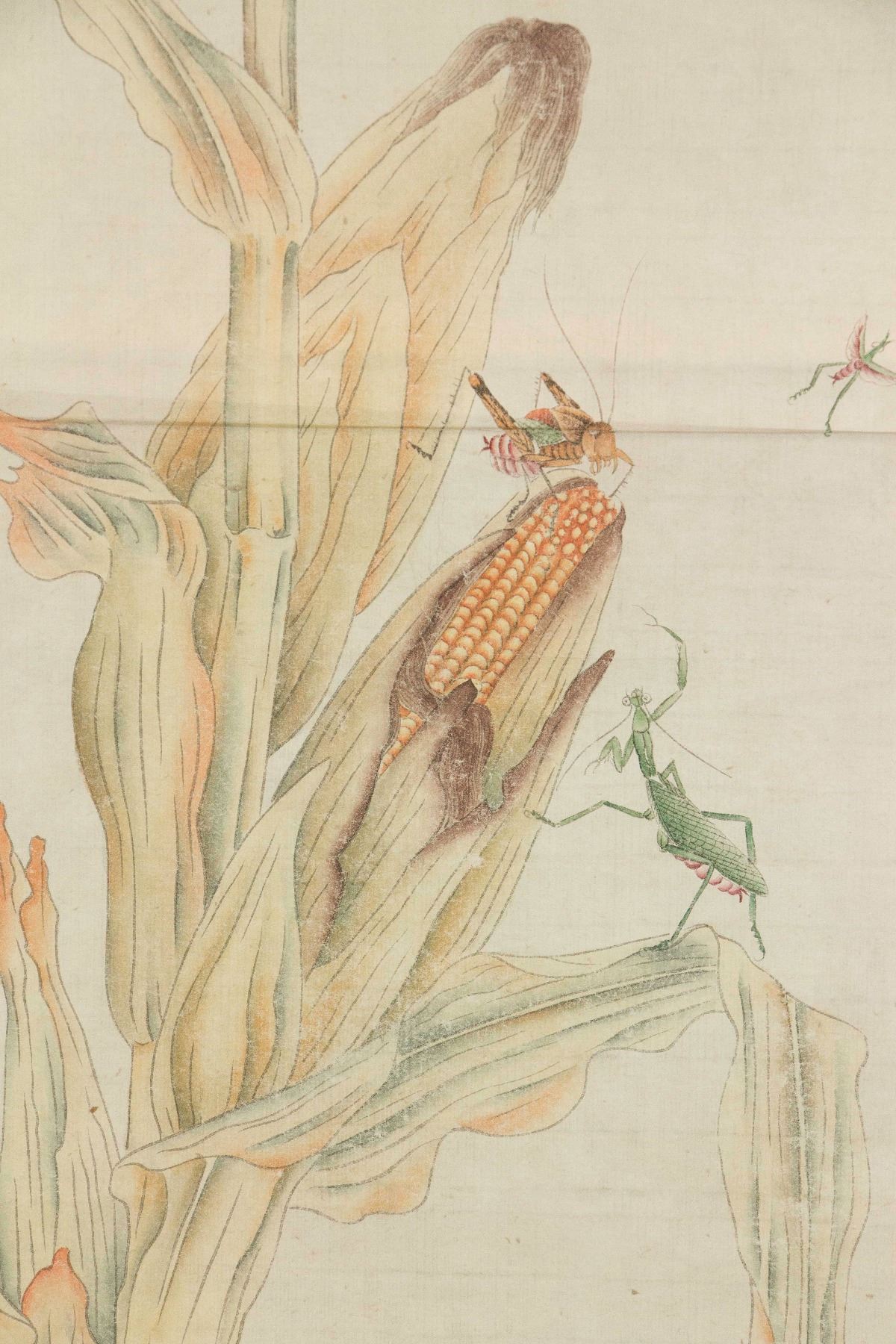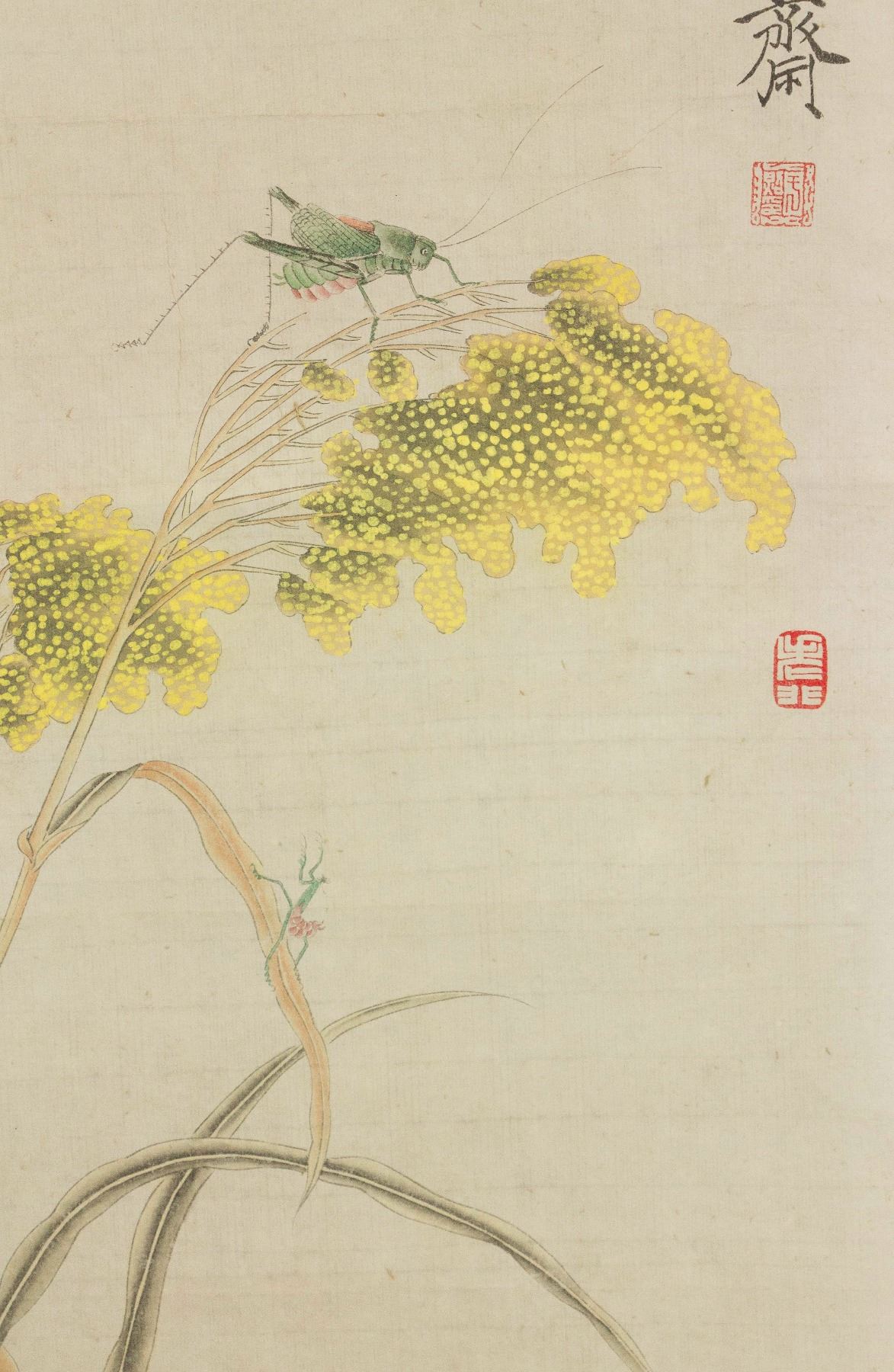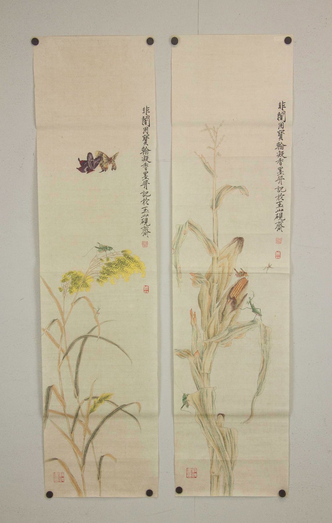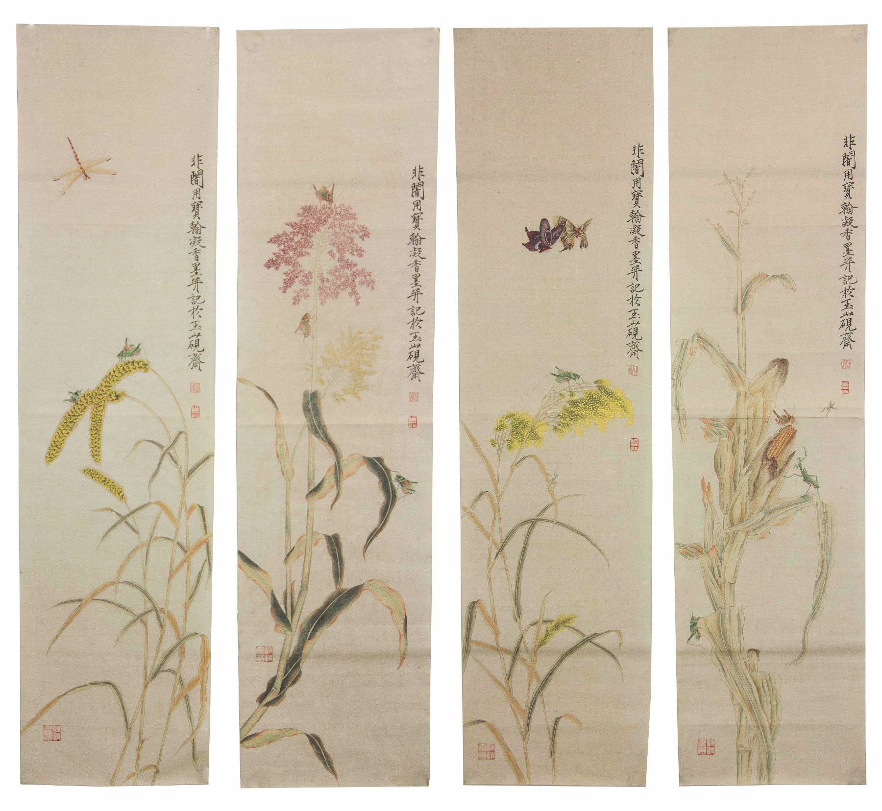 Four pieces painting of varies plants and insects including: wheat, corn, butterfly, grasshopper, dragonfly and praying mantis; Chinese ink and watercolour on paper; signed Yu Feian (1889-1959); each one inscribed with 3 artist seal; 31 cm x 33 cm (each)