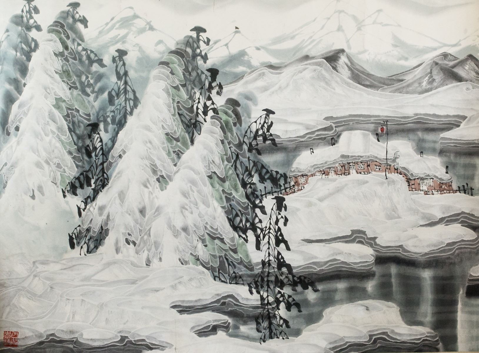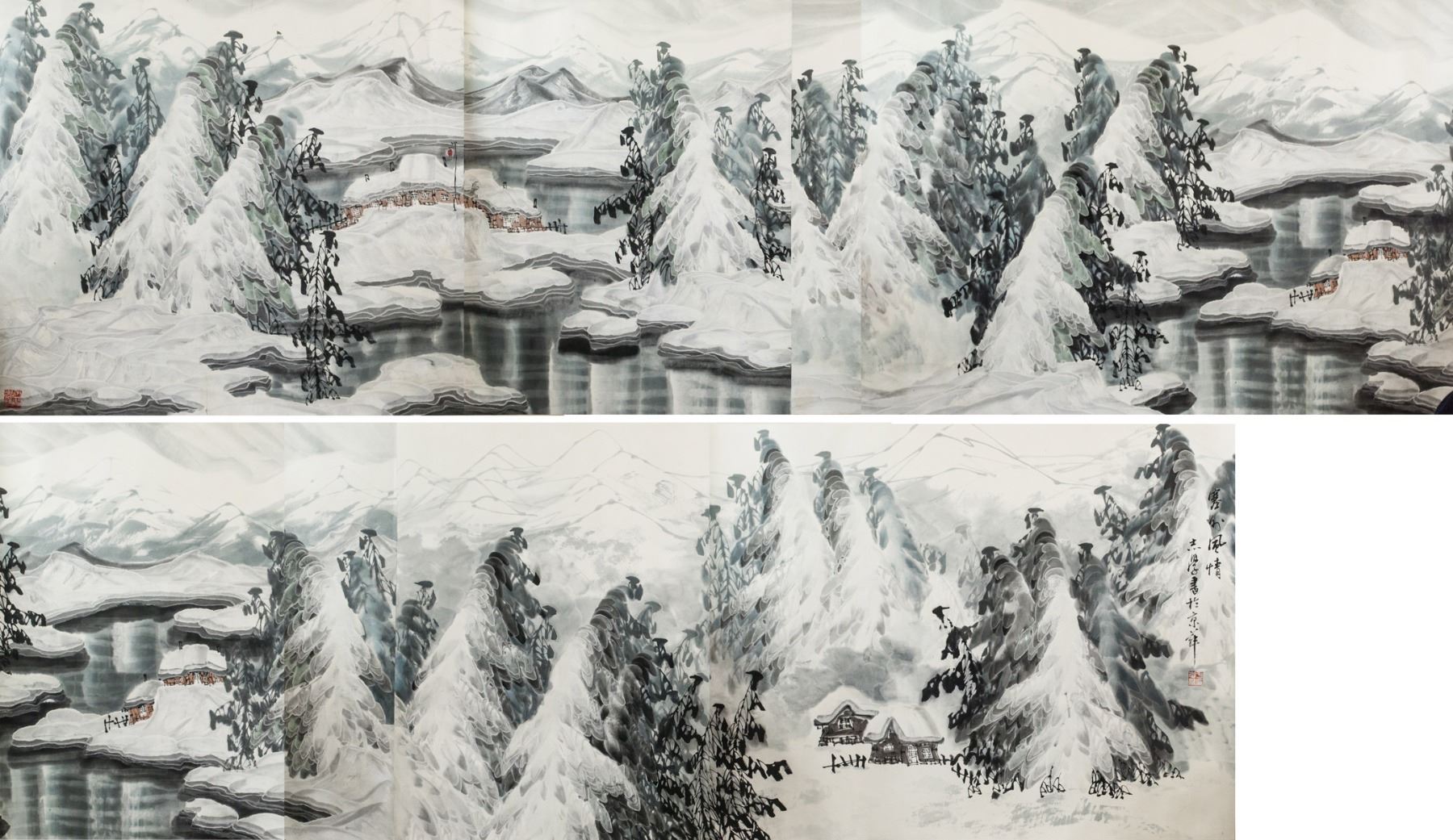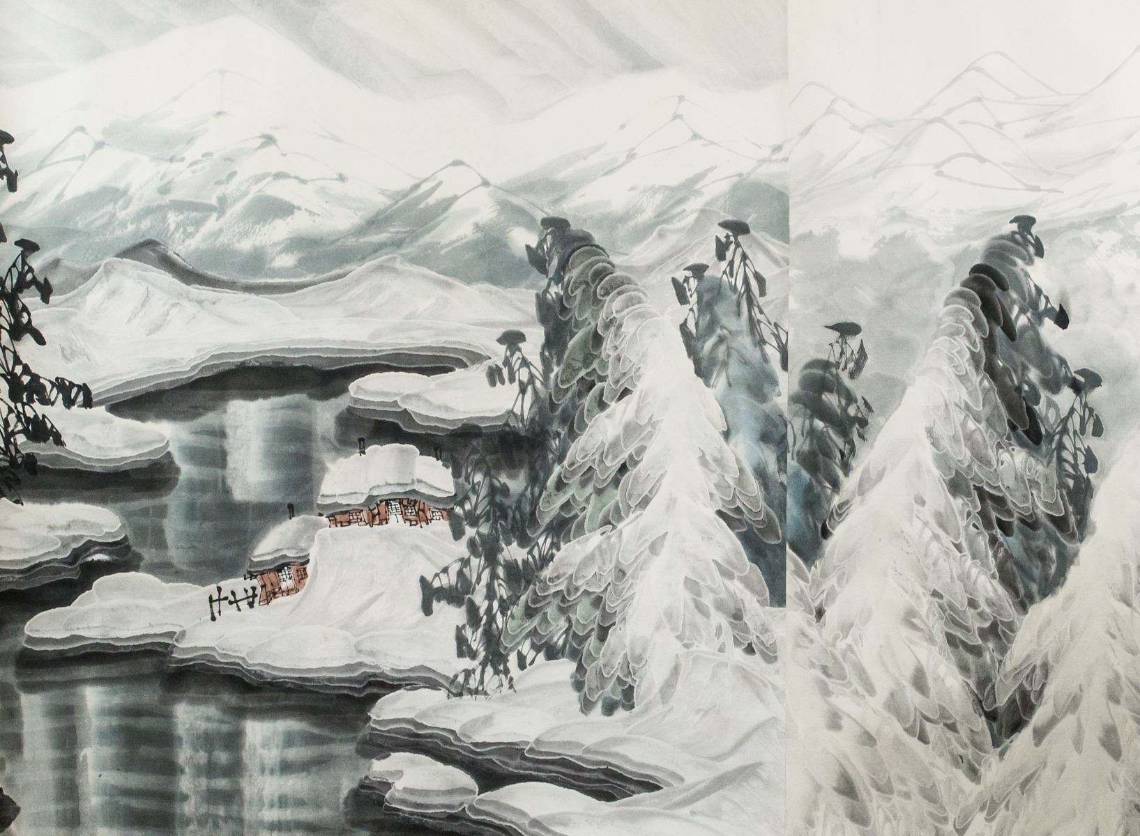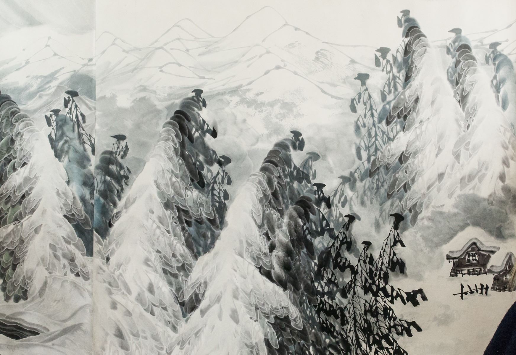 Ink and watercolor on paper roll. Featuring snow landscape. Signed Yu Zhixue (b.1935, Chinese), inscribed with 2 artist seals. 67 x 385 cm