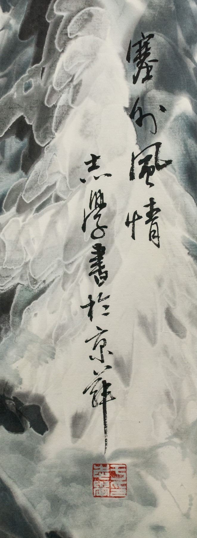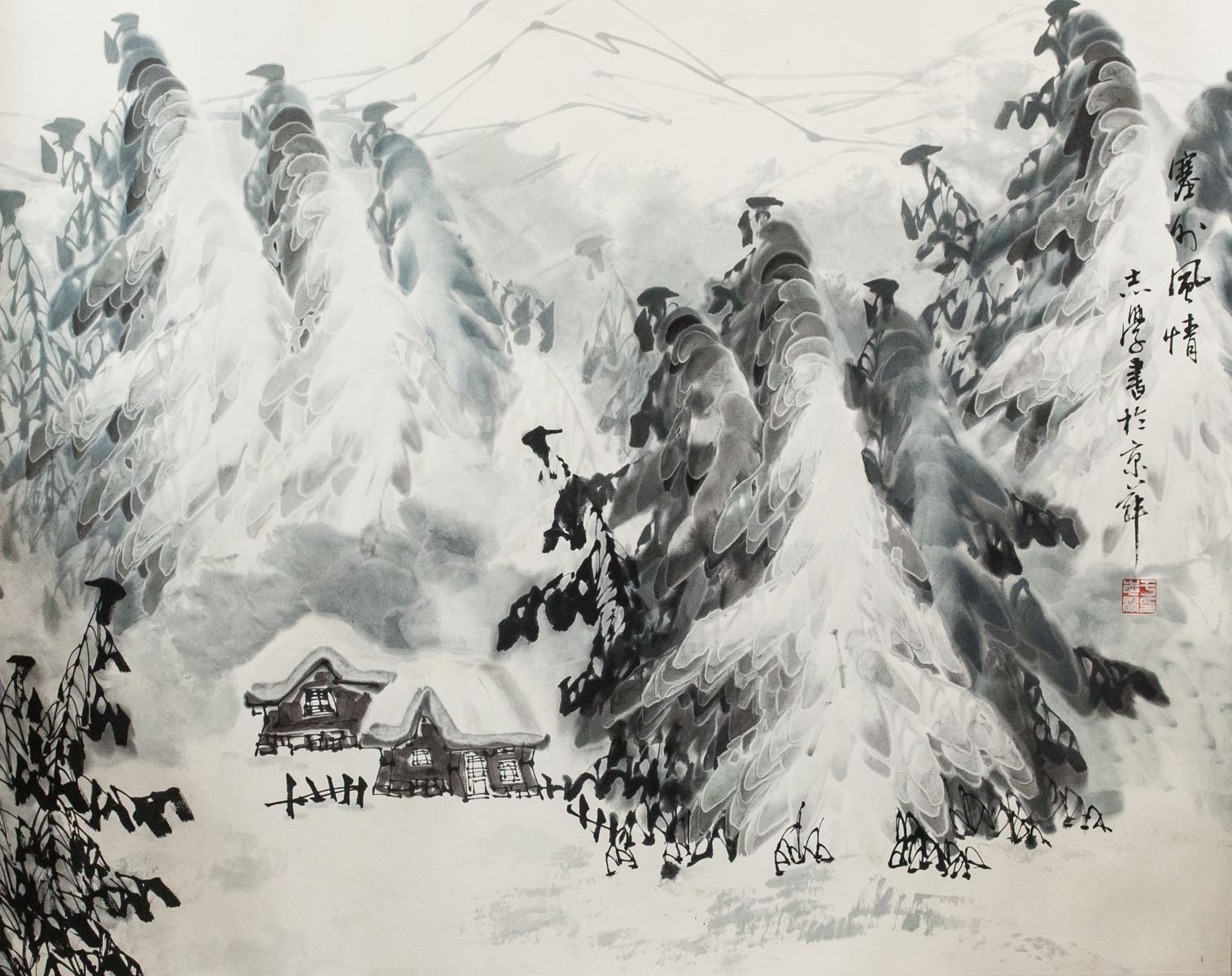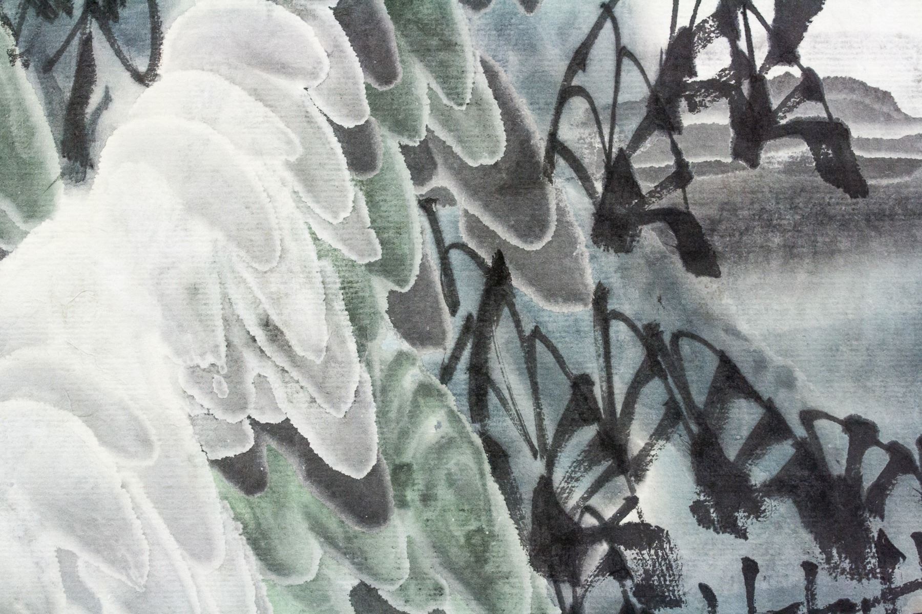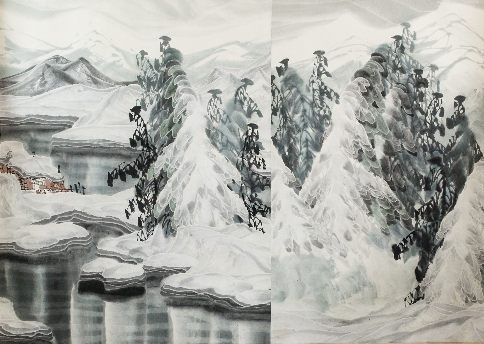 Ink and watercolor on paper roll. Featuring snow landscape. Signed Yu Zhixue (b.1935, Chinese), inscribed with 2 artist seals. 67 x 385 cm