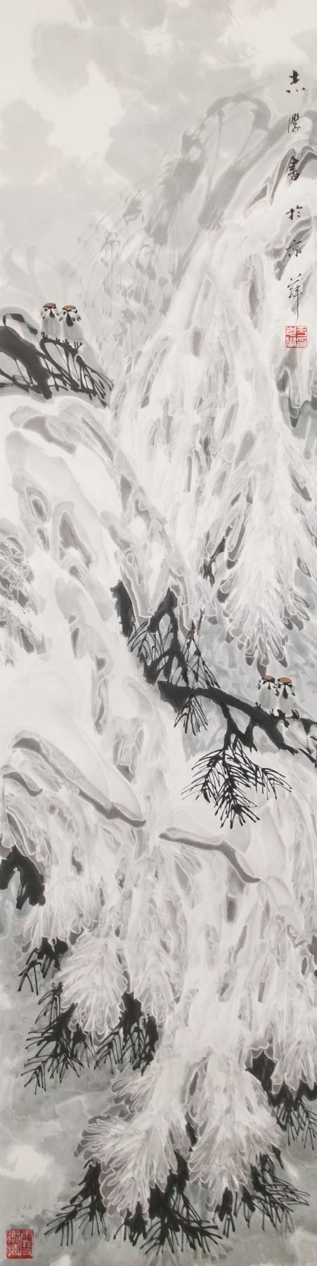 Chinese ink and watercolor on paper. Featuring trees heavily laden with snow. Signed "Zhixue" to the top right. Inscribed with two artist seals. Attributed to Yu Zhixue (1935- , Chinese). 136 x 35 cm.