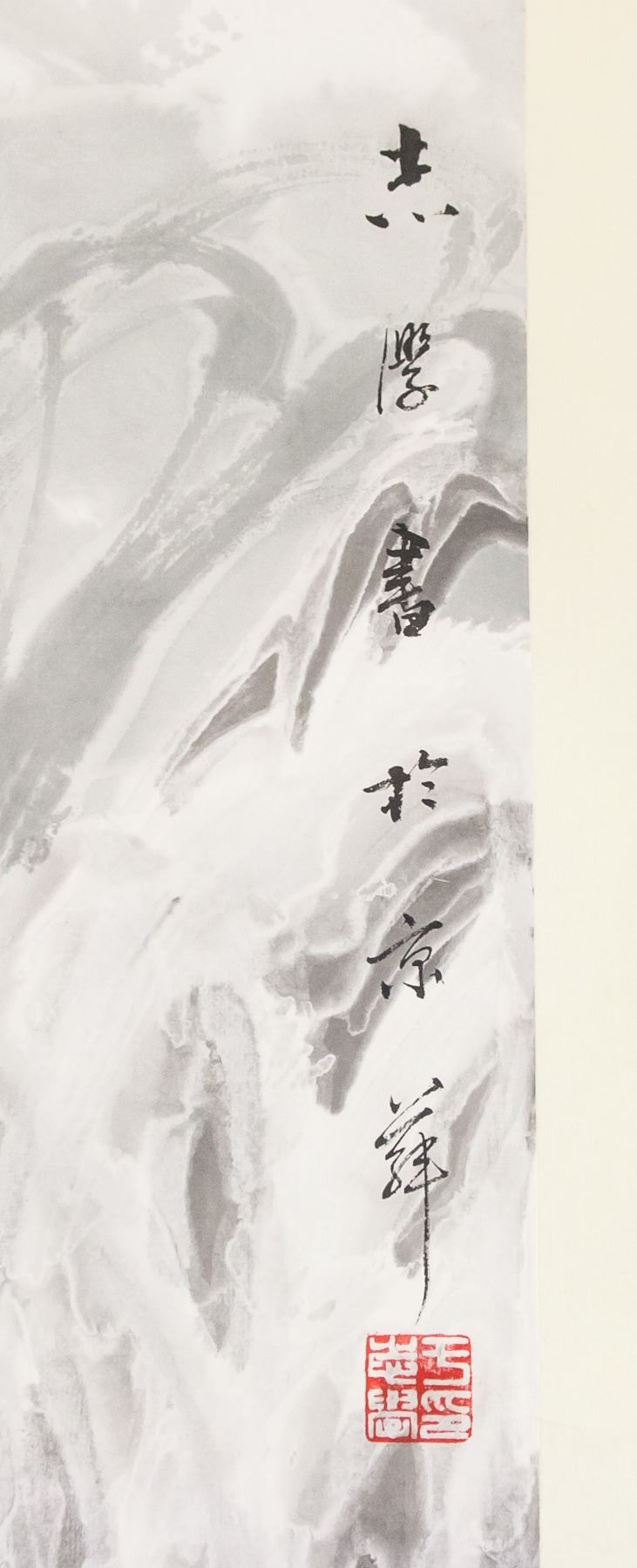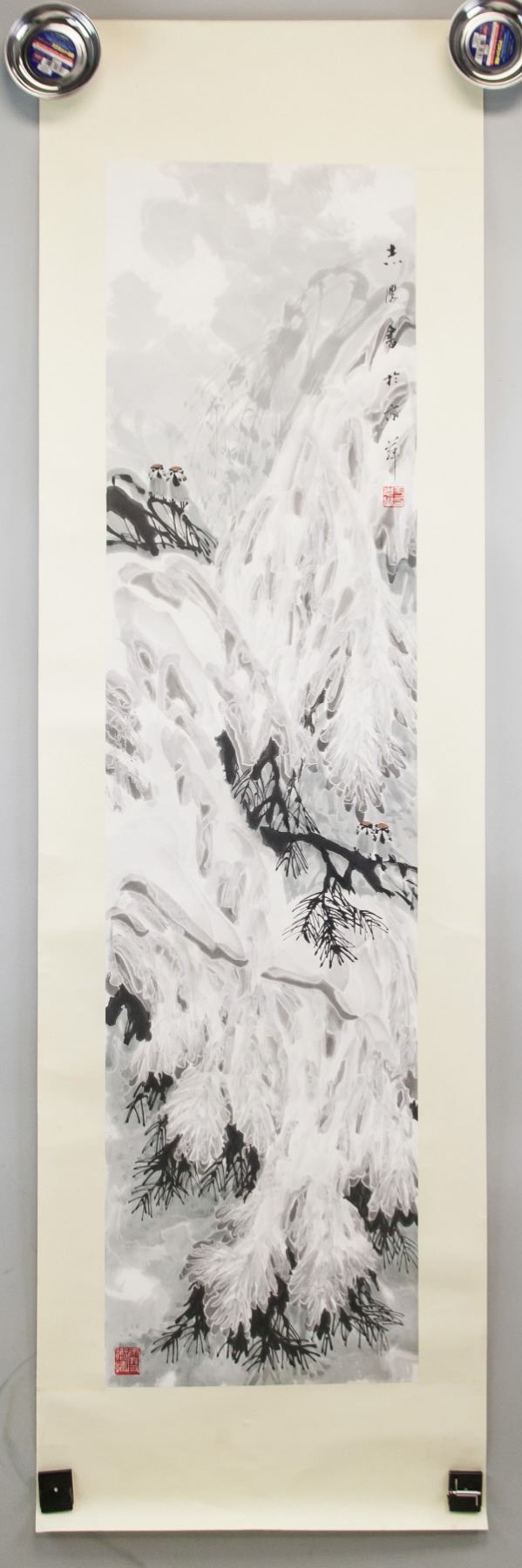 Chinese ink and watercolor on paper. Featuring trees heavily laden with snow. Signed "Zhixue" to the top right. Inscribed with two artist seals. Attributed to Yu Zhixue (1935- , Chinese). 136 x 35 cm.