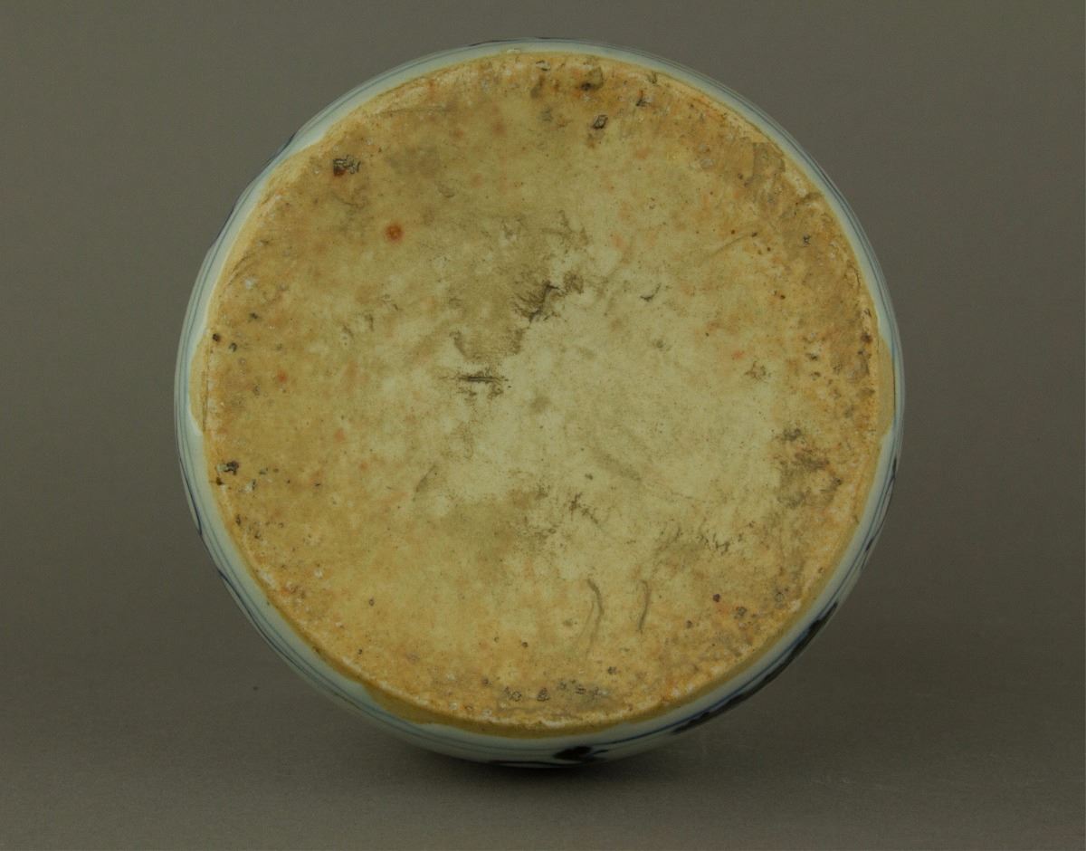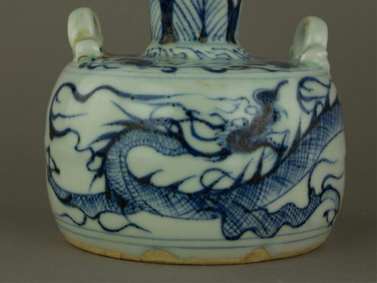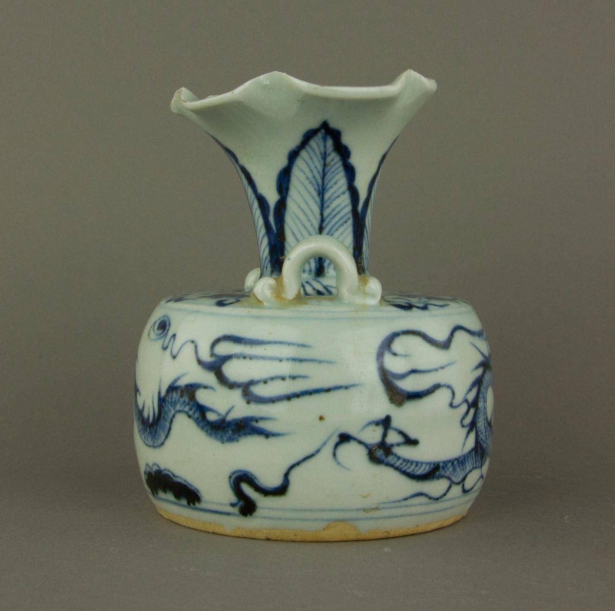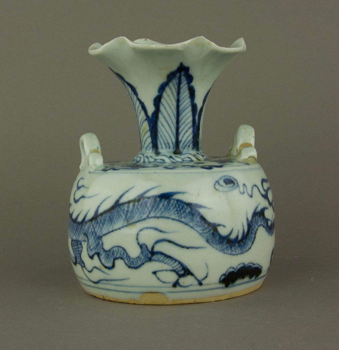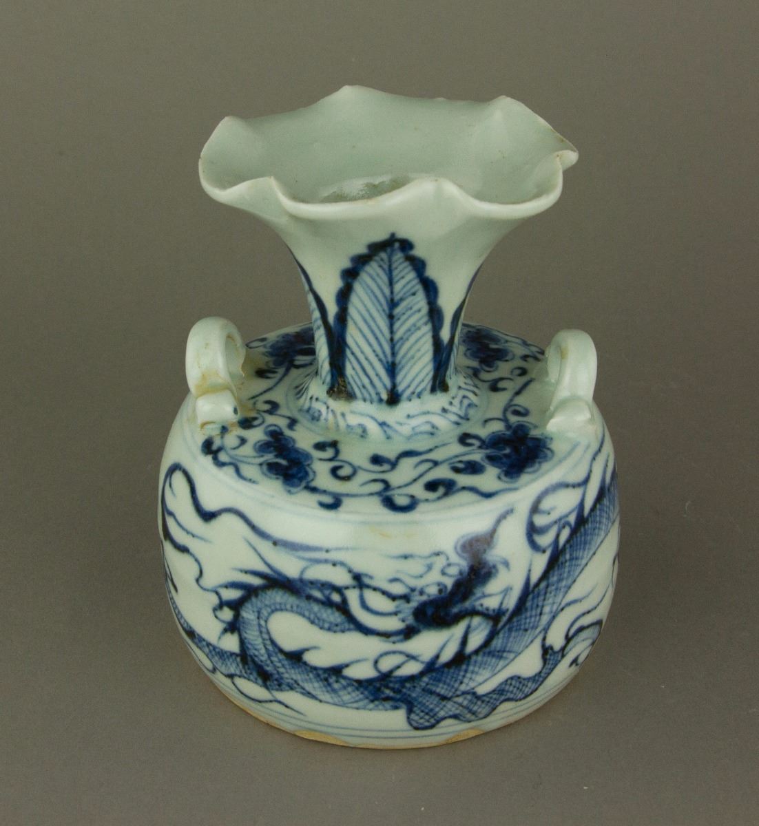 Chinese blue and white porcelain vase; 14th to 15th century; of drum-shaped body with splayed foliated rim; flanked by double curved handles on shoulder; painted with five-clawed dragon amidst clouds; unglazed base; H: 12 cm, D: 10 cm, 373 grams