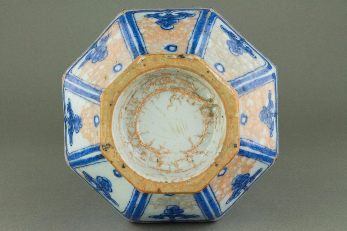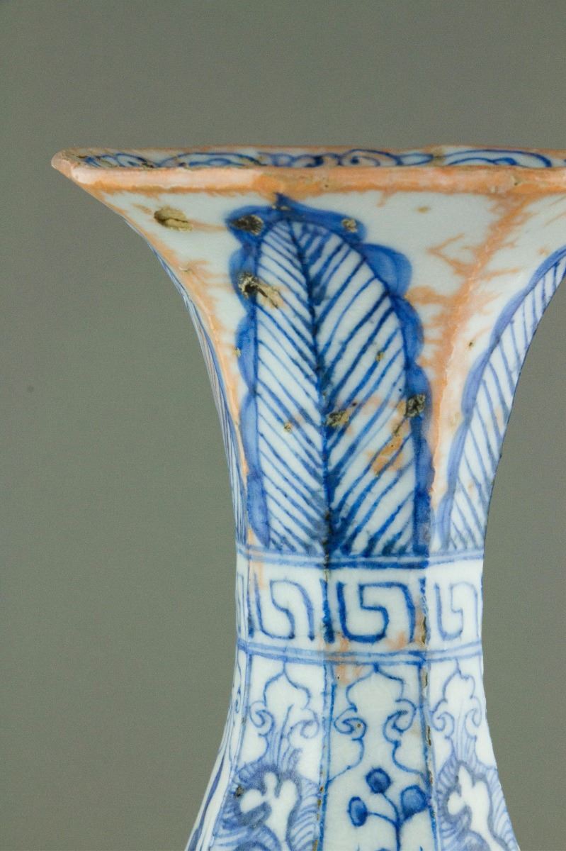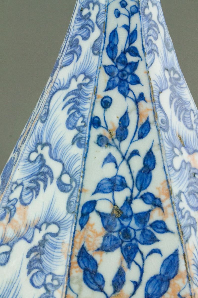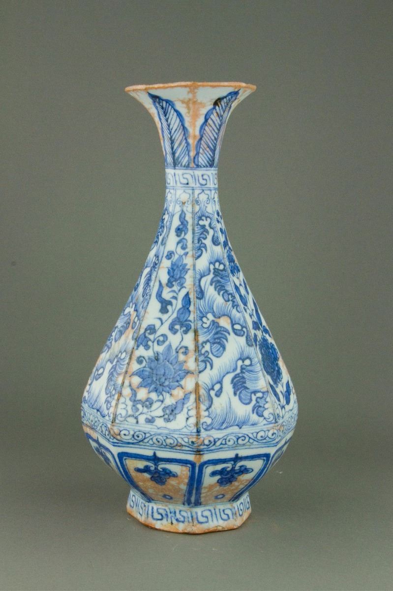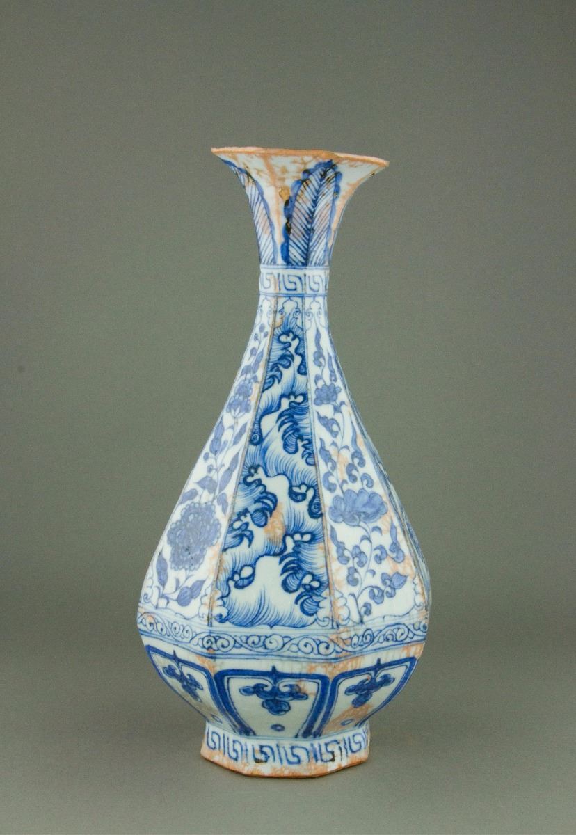 Chinese Yuan or Ming style blue and white porcelain vase; of octagon Yuhuchun form with splayed foot; painted in underglaze blue with alternating panels of floral sprays and breaking waves; H: 30 cm, D: 15 cm, 1049 grams