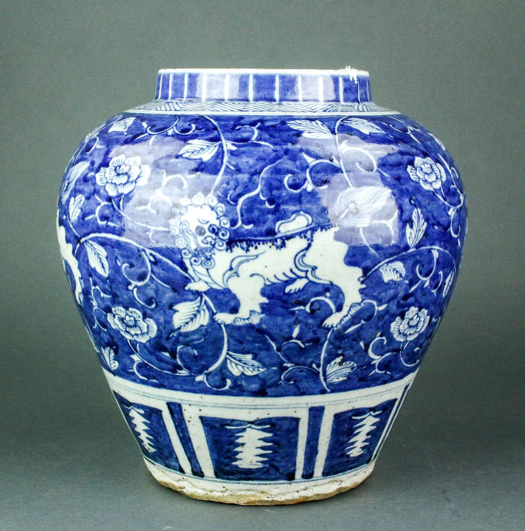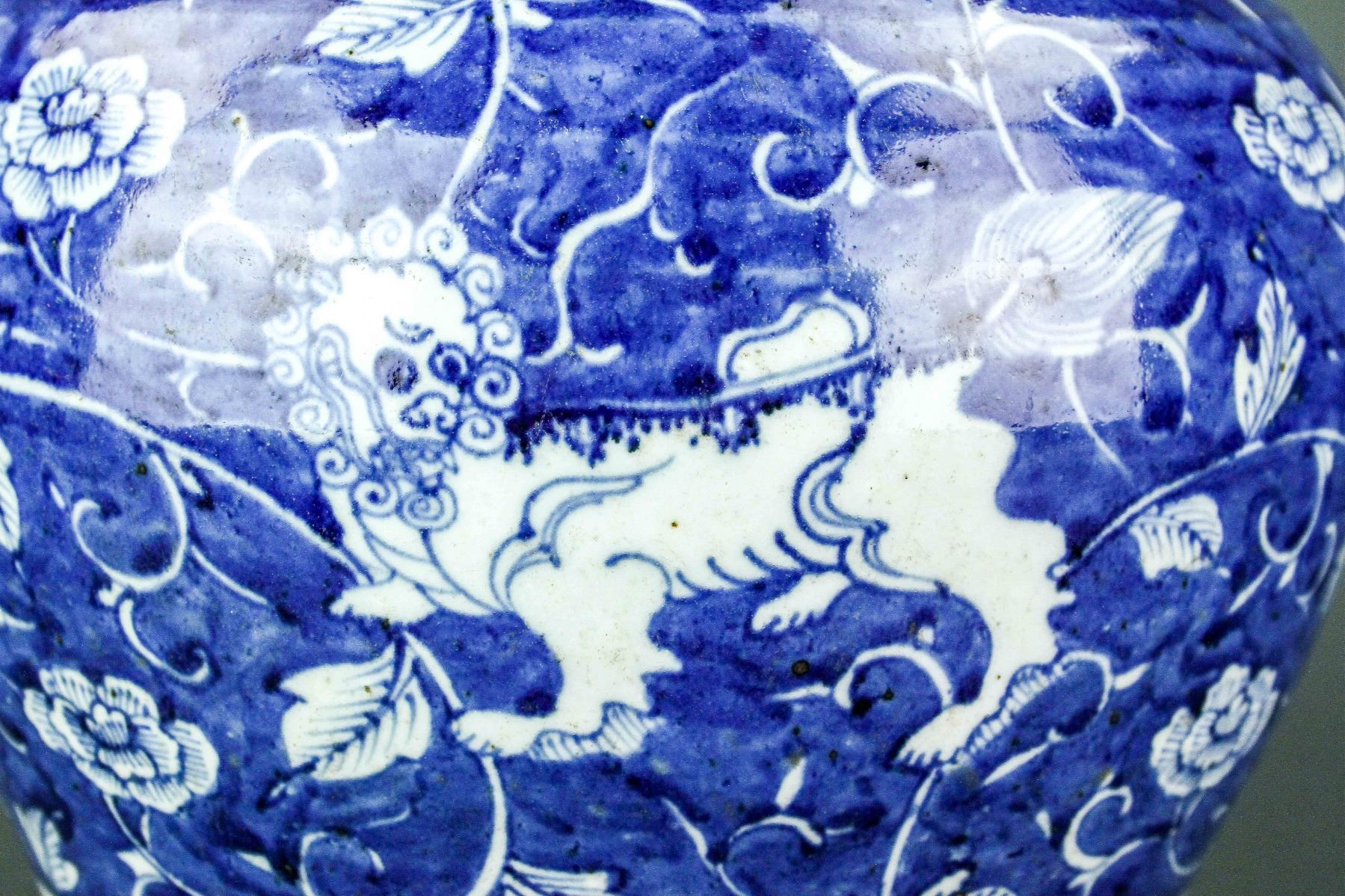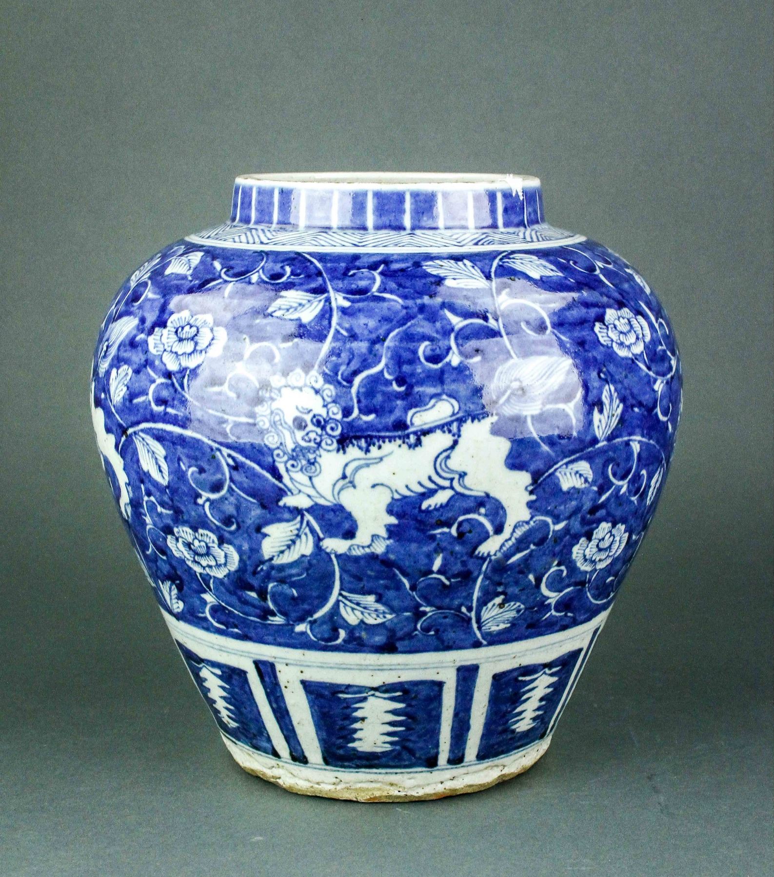 Chinese blue and white porcelain jar; of globular body tapering to the bottom and upright round opening; featuring Qilin beasts on peony scrollwork ground; H: 26 cm, D: 24 cm, 2771 grams