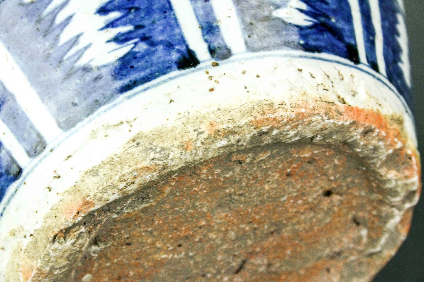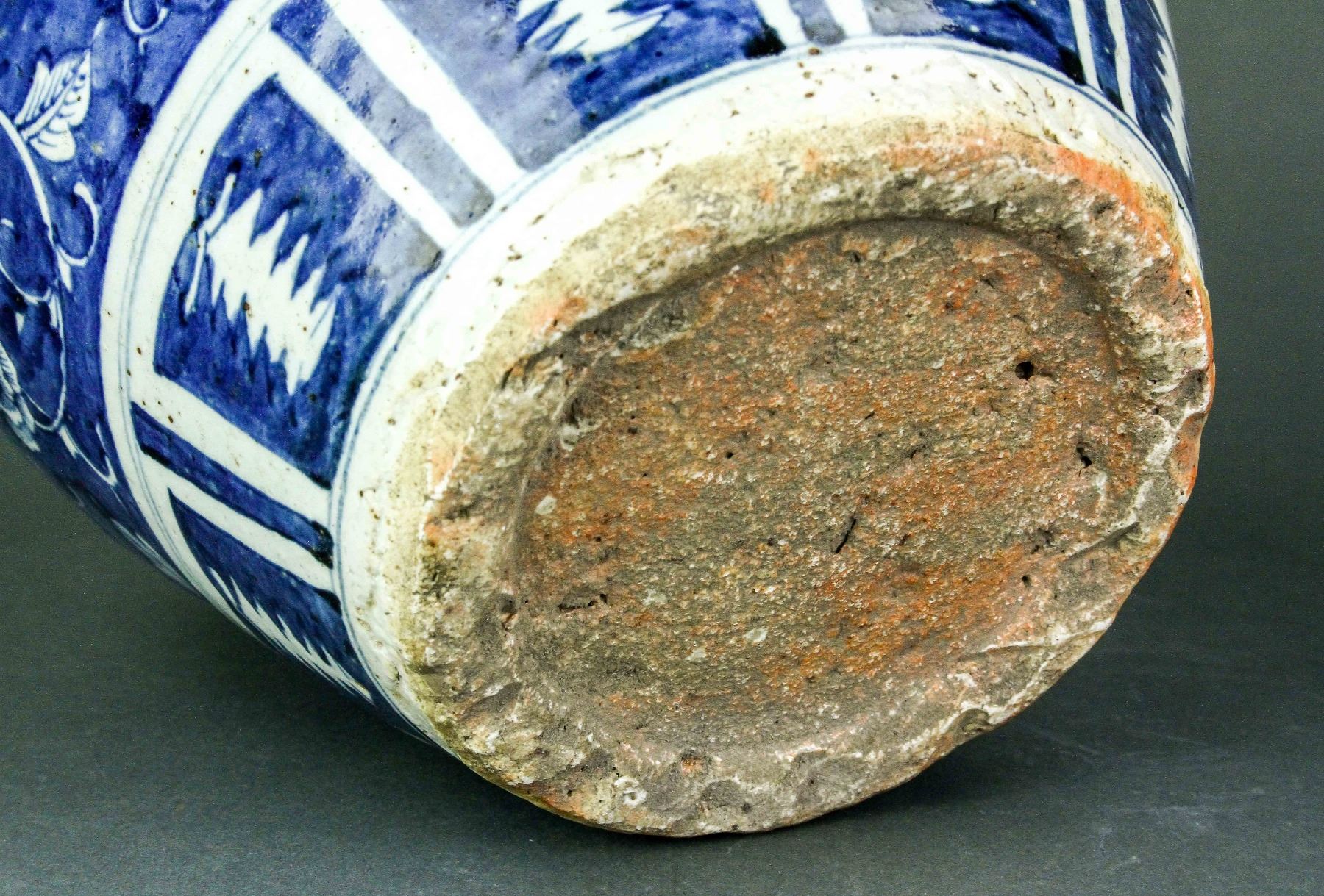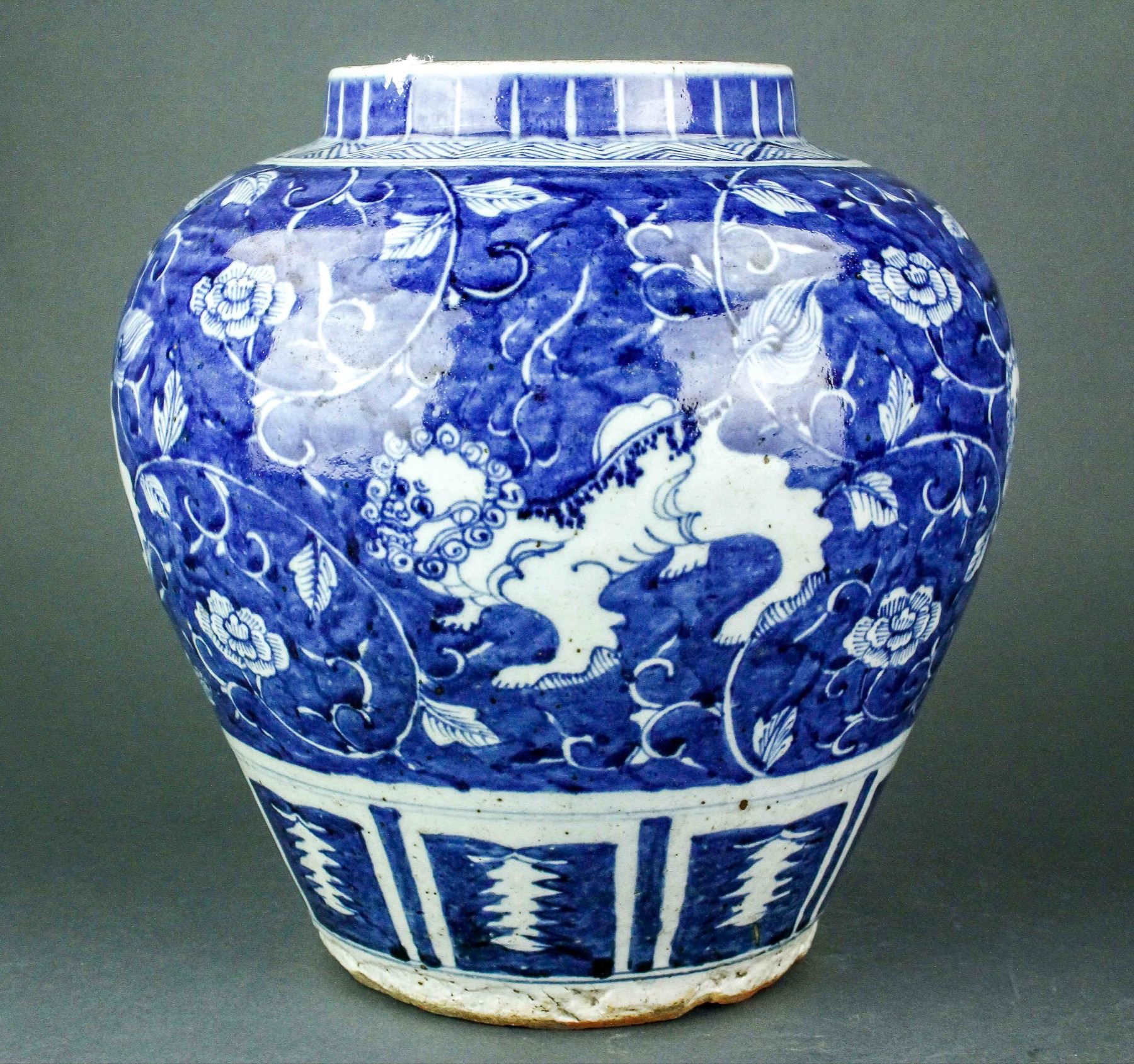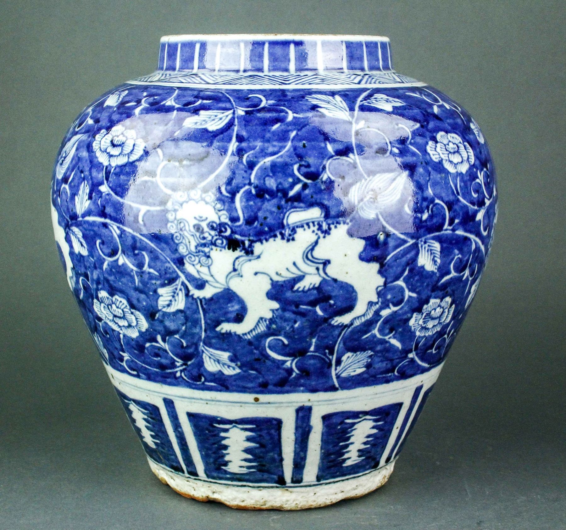 Chinese blue and white porcelain jar; of globular body tapering to the bottom and upright round opening; featuring Qilin beasts on peony scrollwork ground; H: 26 cm, D: 24 cm, 2771 grams