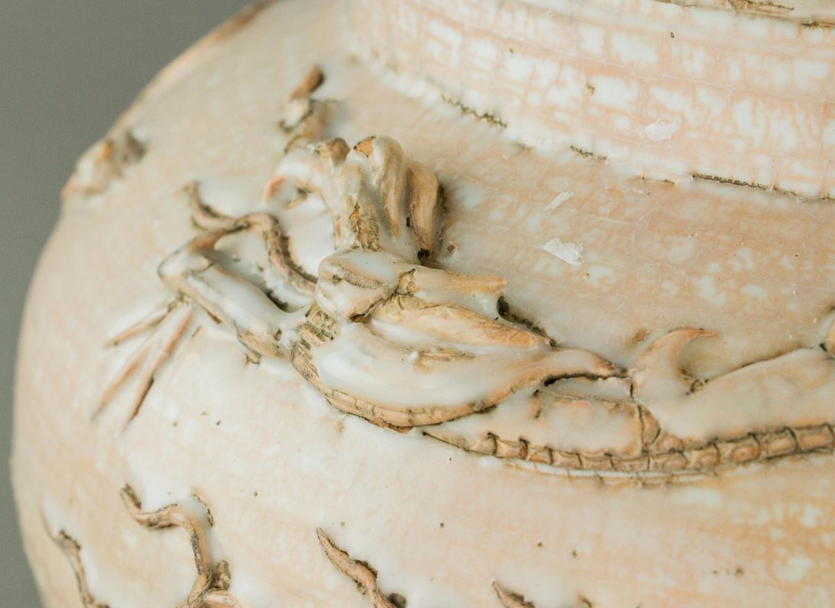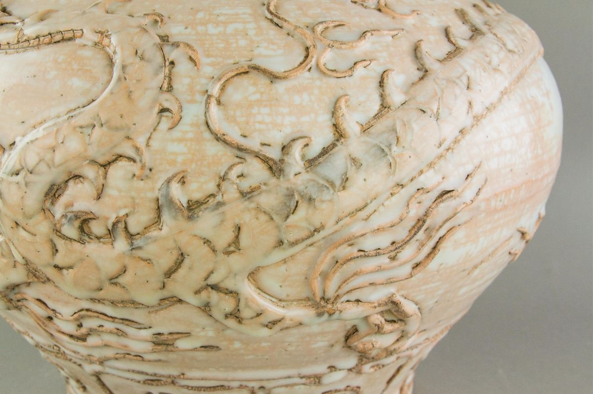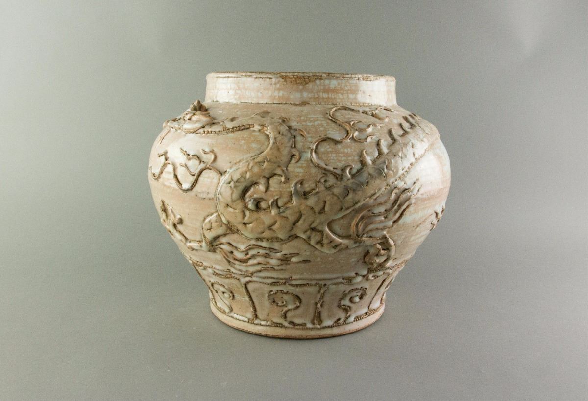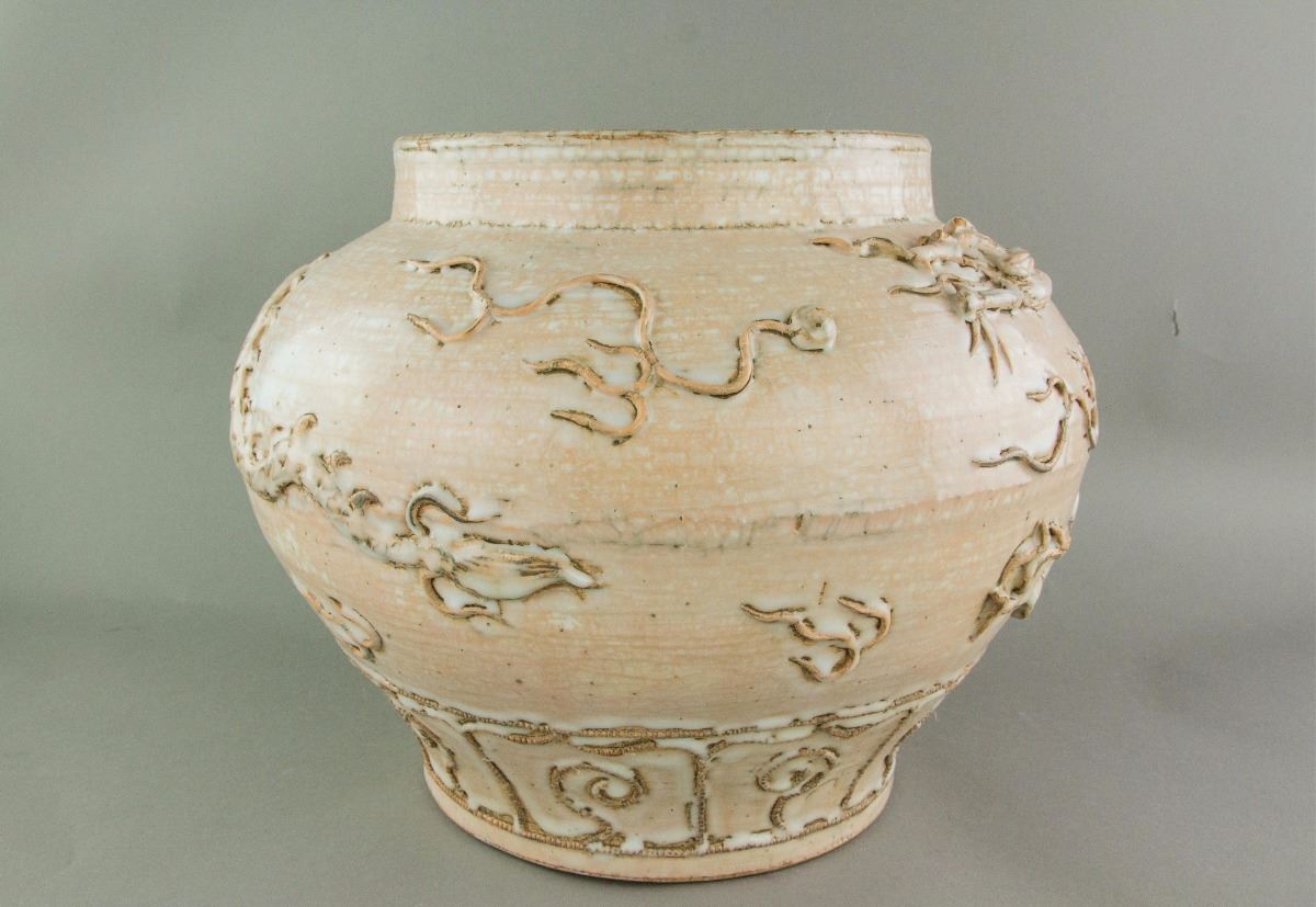 Chinese large porcelain jar; Yuan or Ming period; of compressed globular body tapering to the bottom; decorated with raised striding dragon amidst clouds on body; covered in light brown glaze; H: 29 cm, D: 33 cm, 5 kilograms