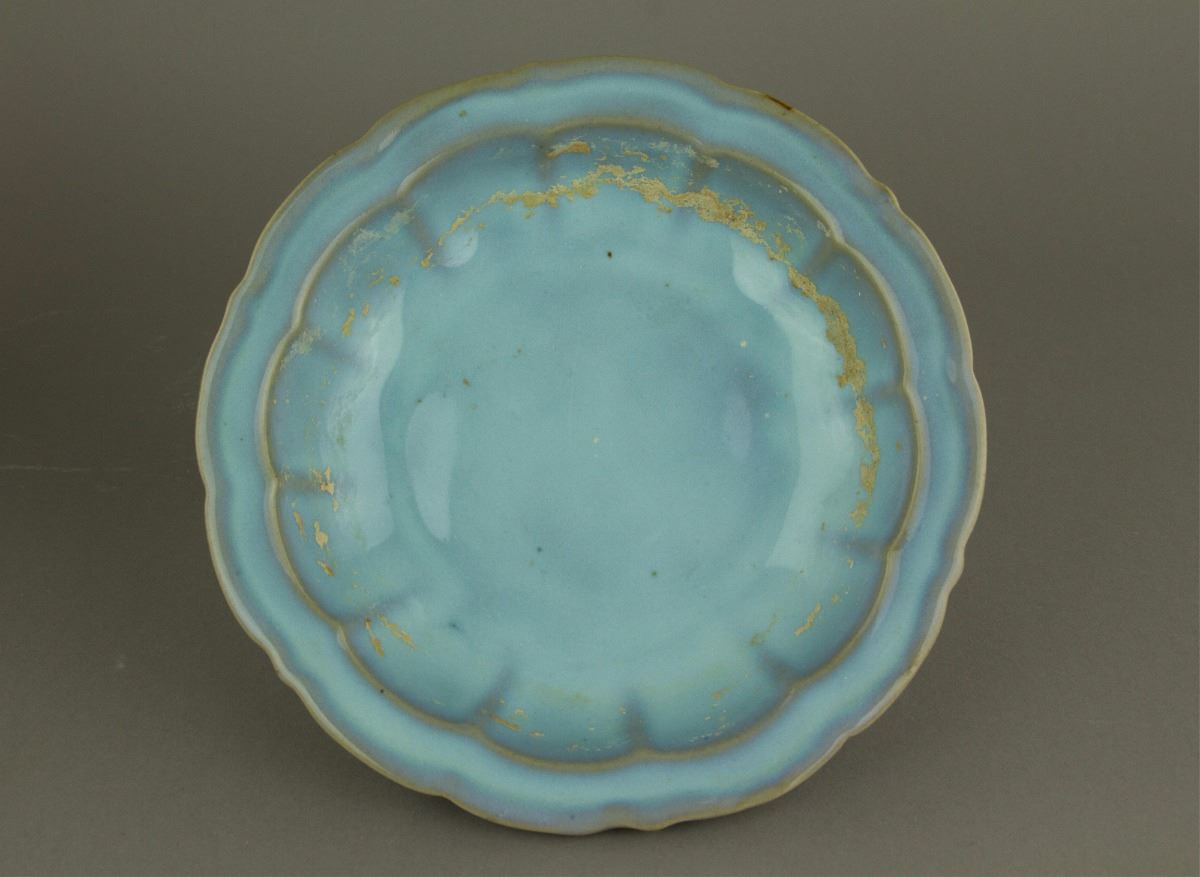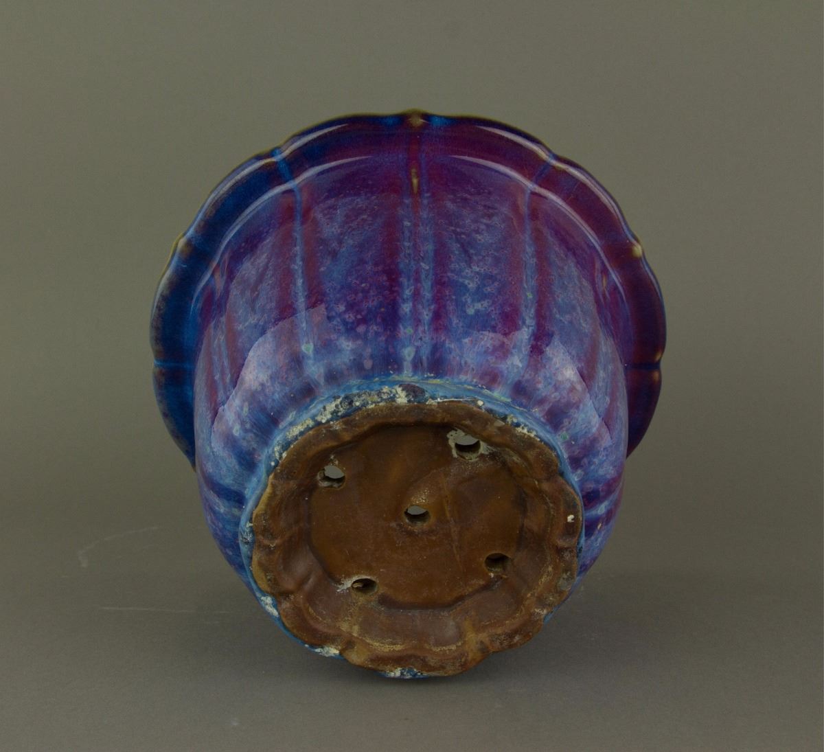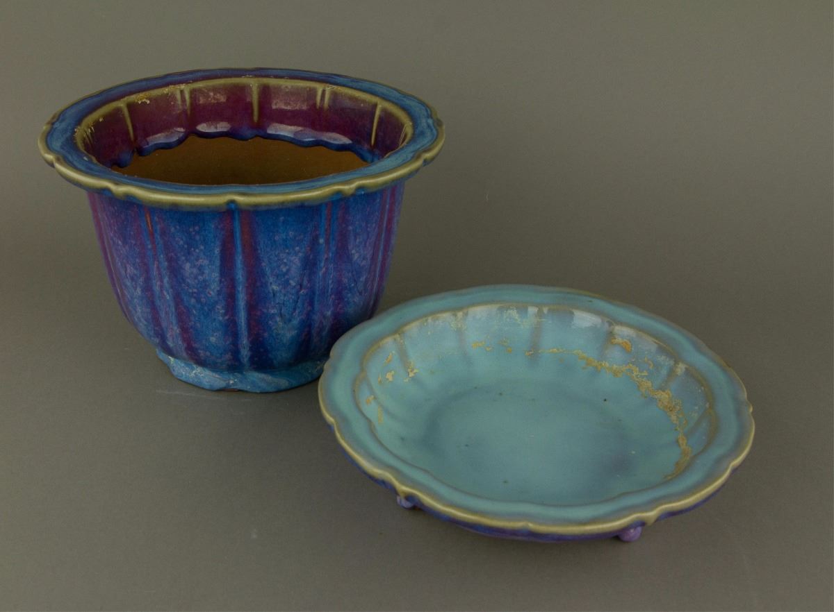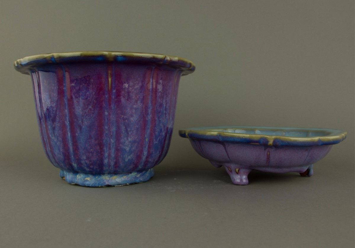 Two pieces of Chinese rare Junyao porcelain planter and bowl; Yuan or Ming period; the planter of lobed body with everted rim; the foliated bowl supported on three feet; covered in purplish blue glaze; H: 15.5 cm, D: 20.5 cm, 2011 grams