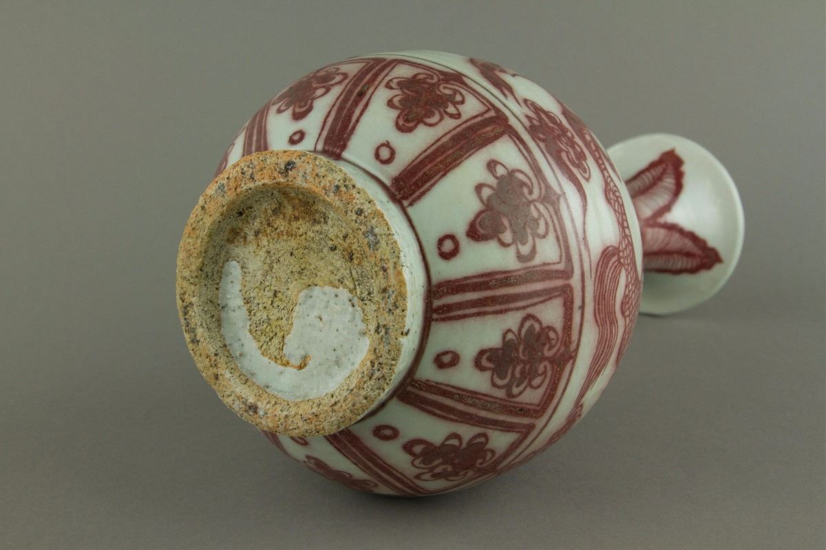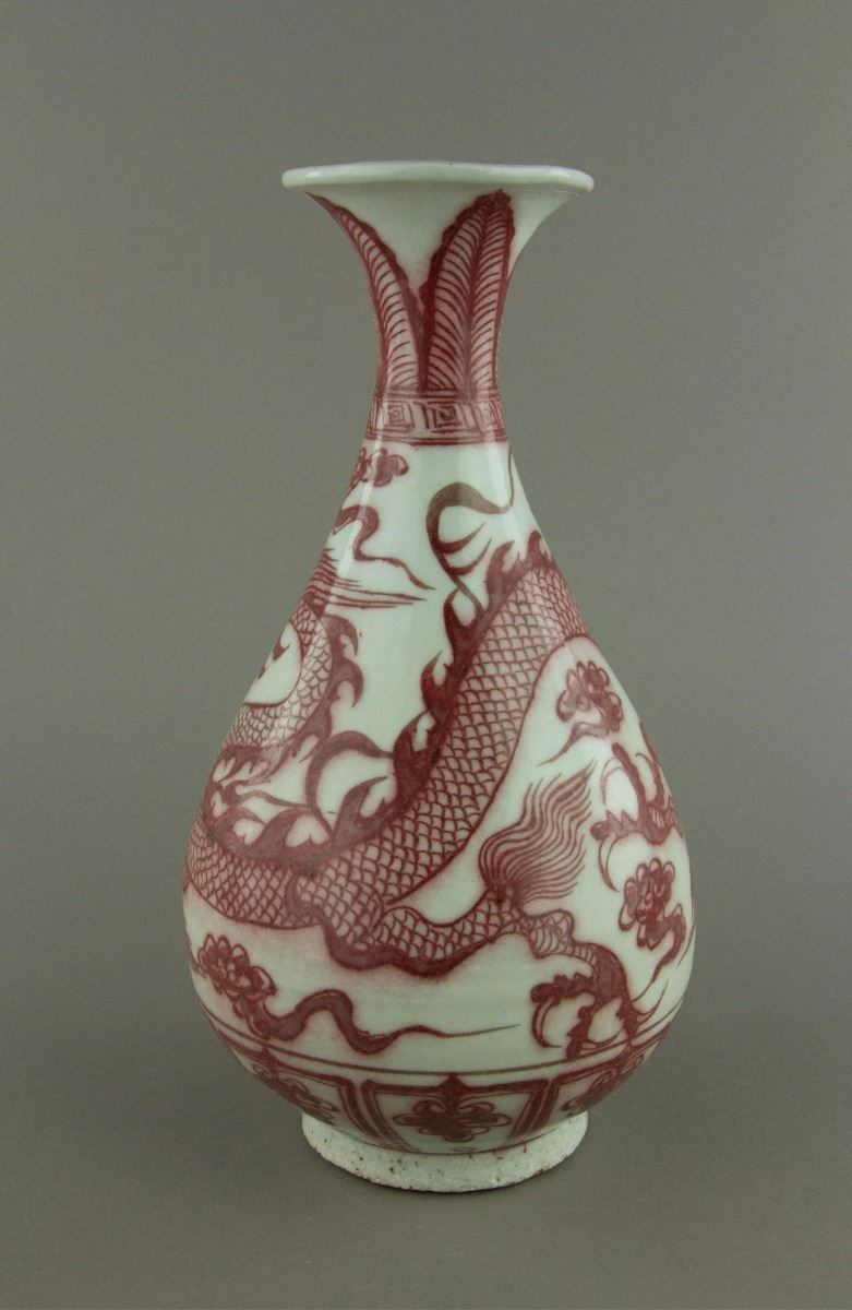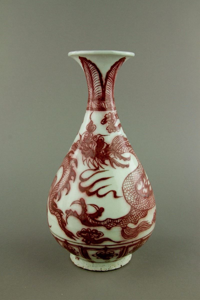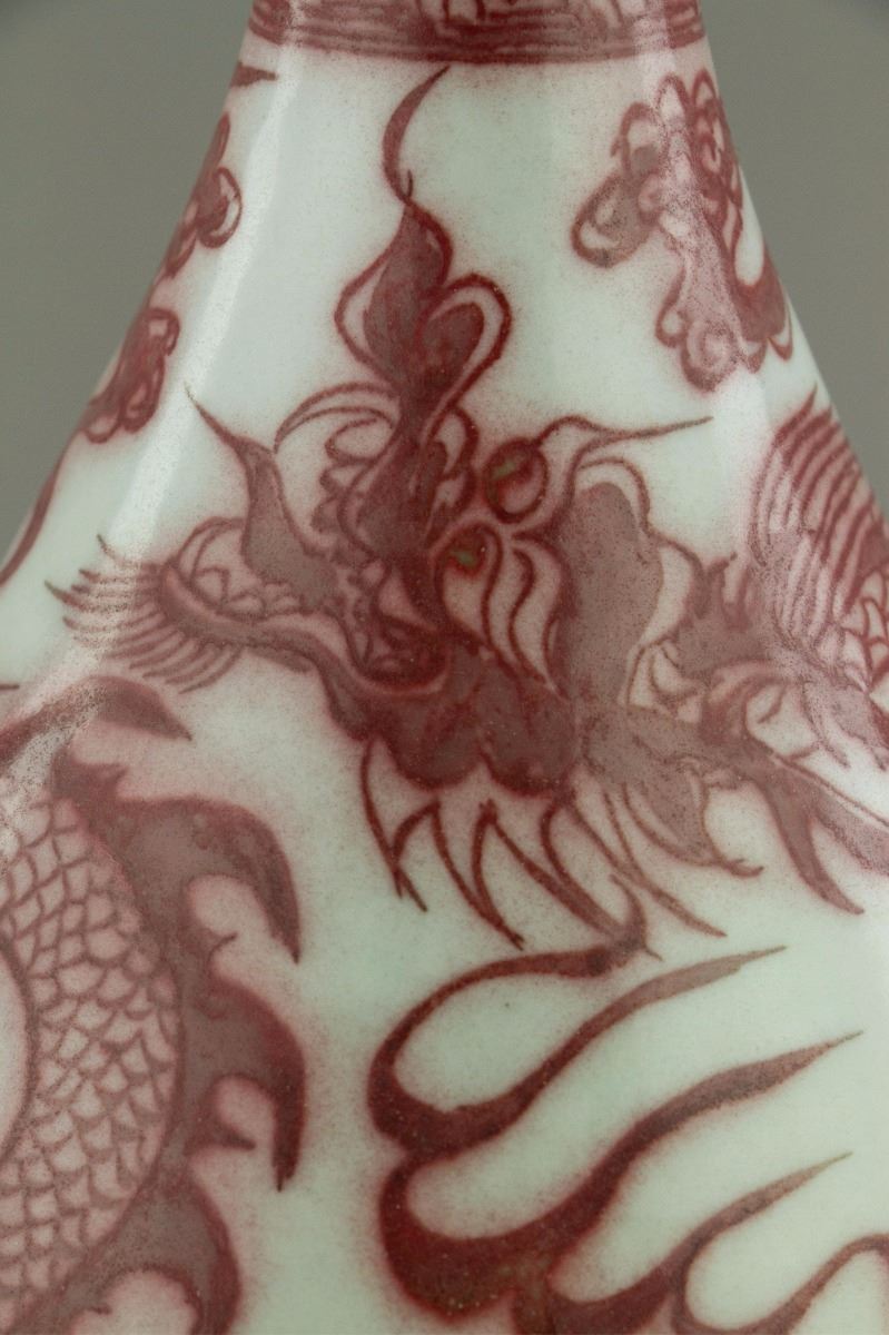 Chinese Yuan or Ming style copper red porcelain vase Yuhuchun Ping; of pear-shaped body with everted rim; painted with crouching dragon amidst clouds; unglazed base; H: 31 cm, D: 14 cm, 1140 grams