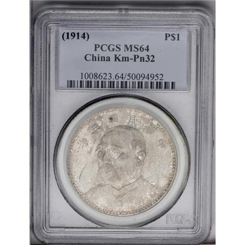 <B>Yuan Shih-kai Silver Pattern Dollar 1914,</B></I> Bust half-profile to left/Value in wreath, KM-Pn32, Kann-643, Ma-72, nicely toned MS64 PCGS. An extremely rare pattern issue, in Choice condition, and the only piece that we have had the privilege of offering in quite some time.