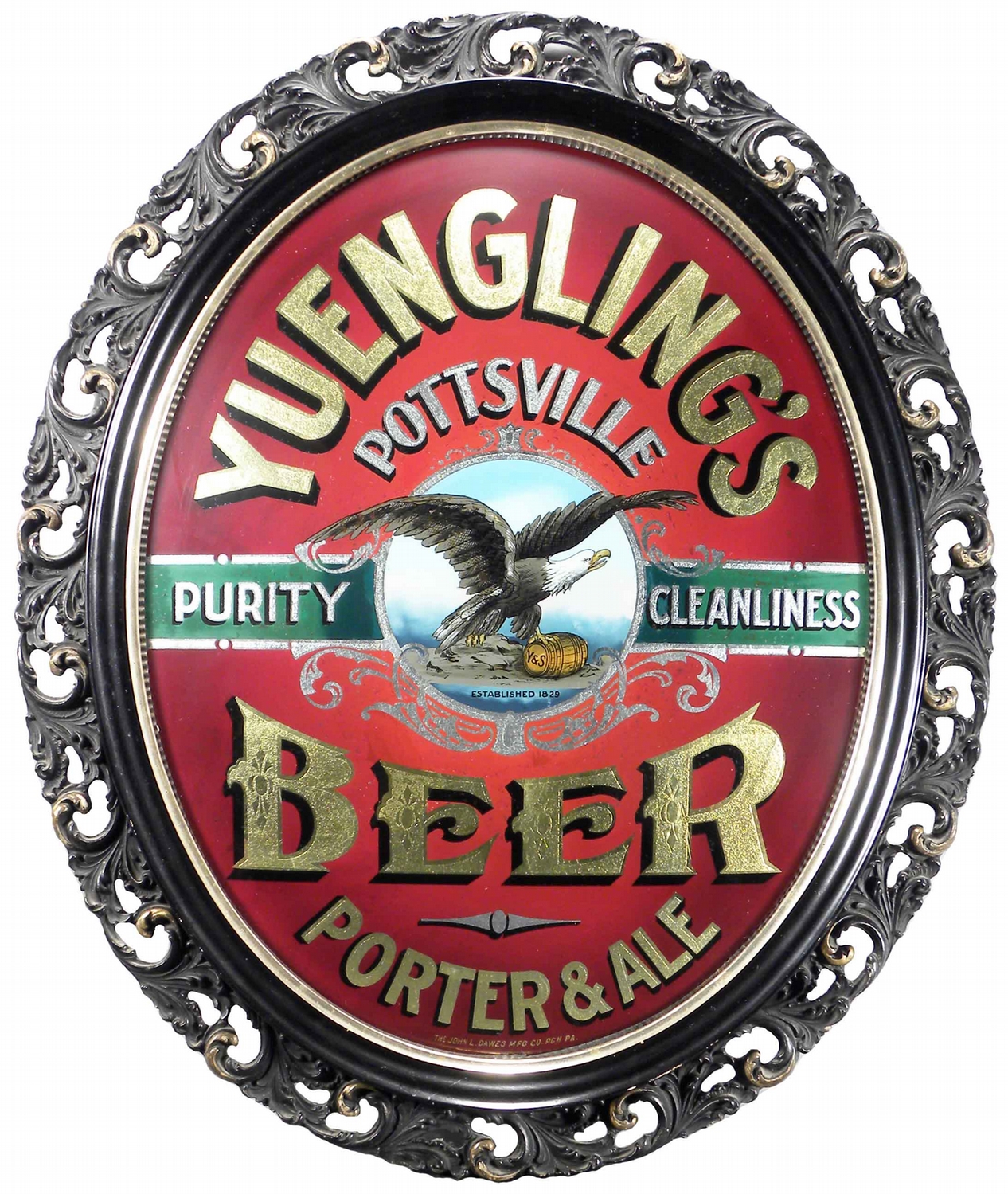 Yuengling's Beer Reverse Glass Sign. Pottsville, PA. The John L Dawes Mfg. Co. Pch PA, makers. Convex oval glass. Near mint condition. 21 X 25 inches overall.