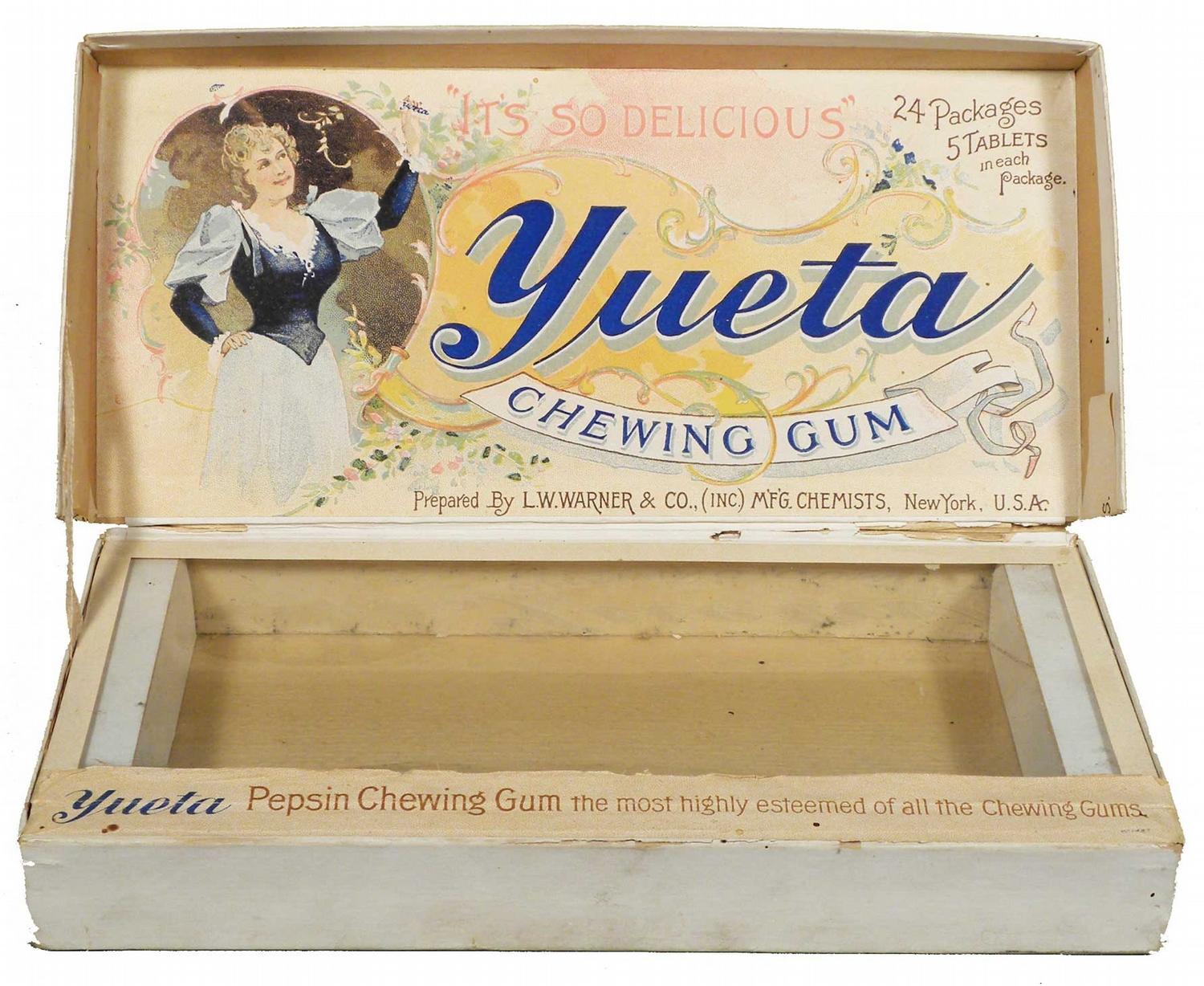 Yueta Chewing Store Display Box. Cardboard and glass. Held 120 pieces in 24 packages. Very good condition. 8 1/2 X 1 1/8 X 4 1/8 inches.