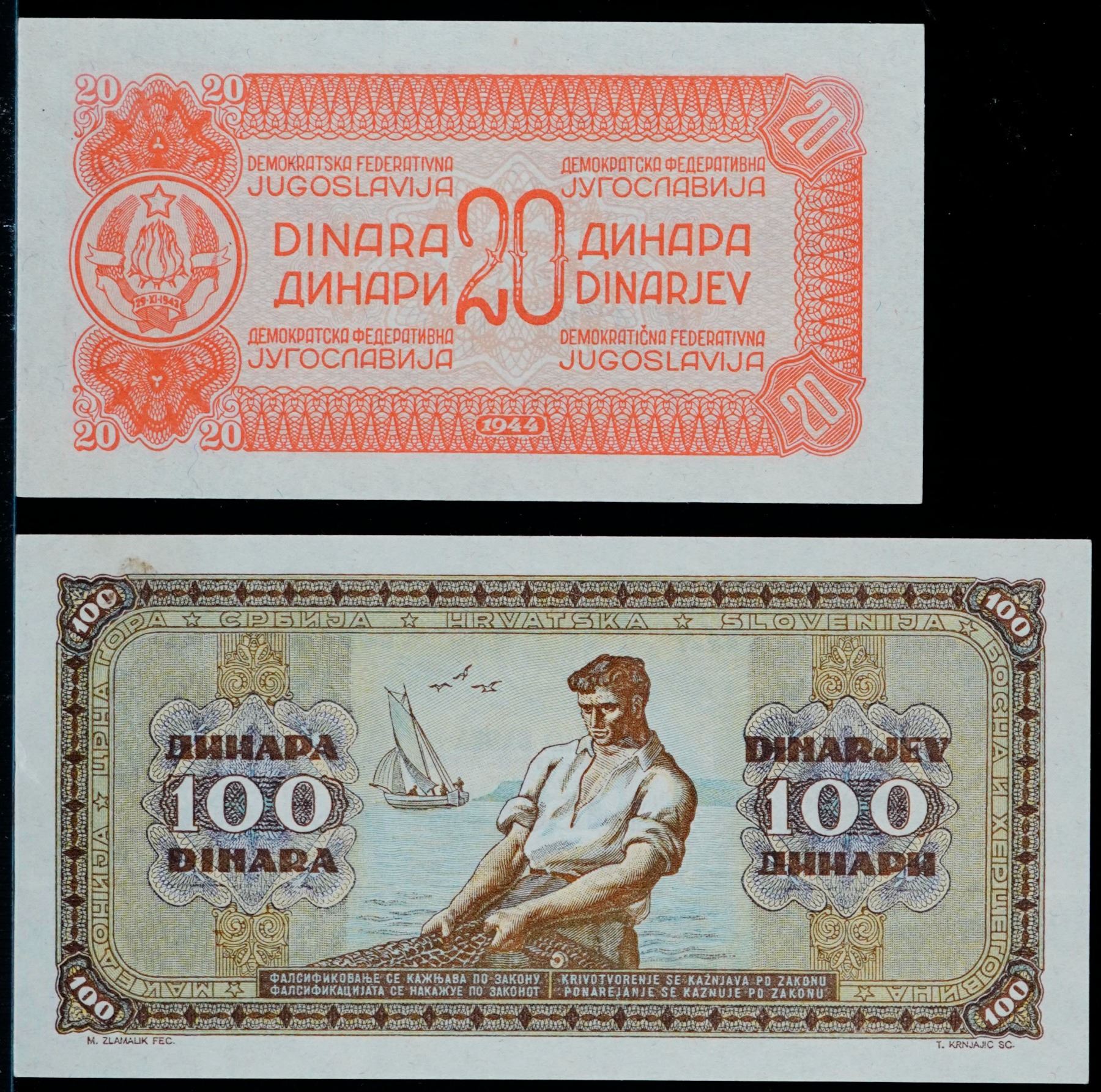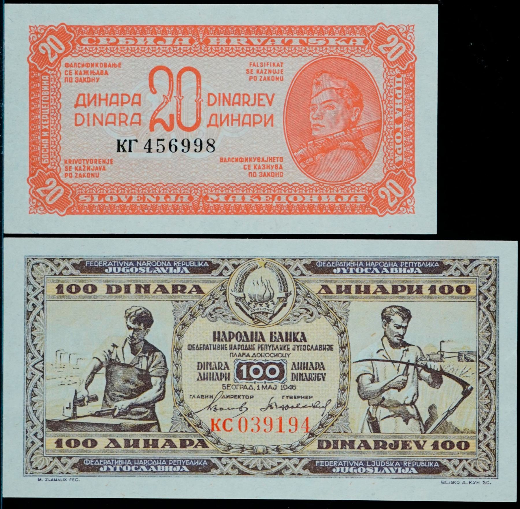 Yugoslavia; 1944-1946 AU to Unc, lot of 2 notes.