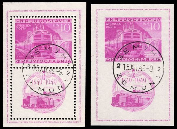 Yugoslavia, Airmail, 1949, Railway souvenir sheets, perf. and imperf. complete. Scott C33, C33a. Neat matching Zemun 1949 c.d.s.'s, VF