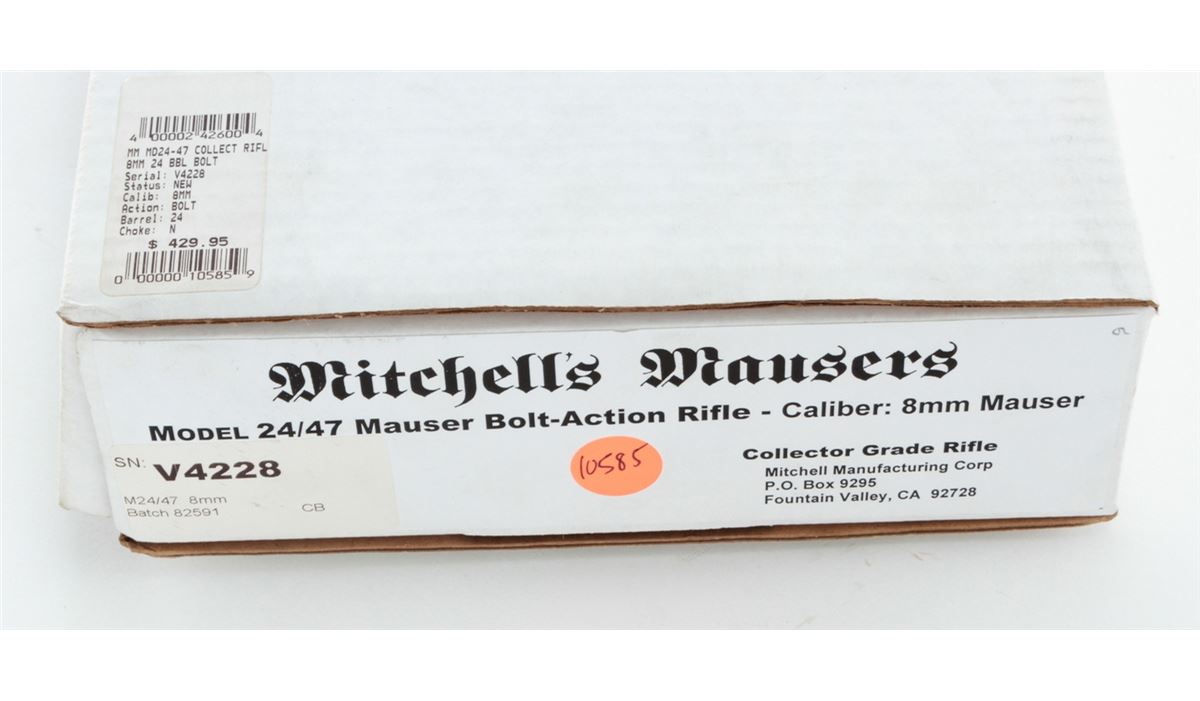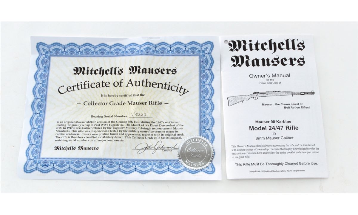 Yugoslavian M24/47 Bolt Action Rifle, #B4228, 8mm, 24'' barrel, blue finish, bright bolt, beech stock. Condition is excellent as imported and refurbished by Mitchell's Mausers, with accessories, in original box. Est.: $250-$400. (C&R) (Field Time)