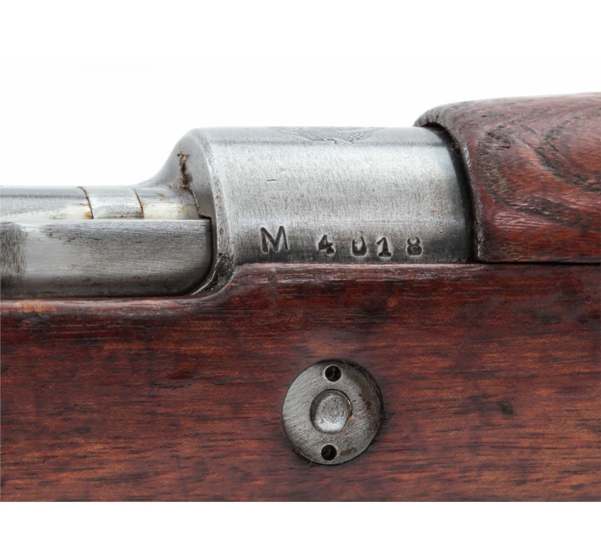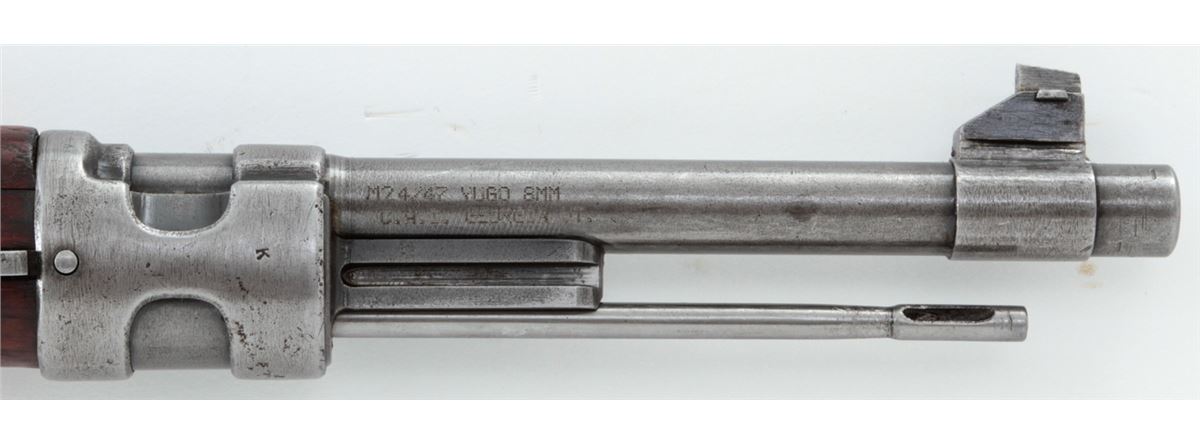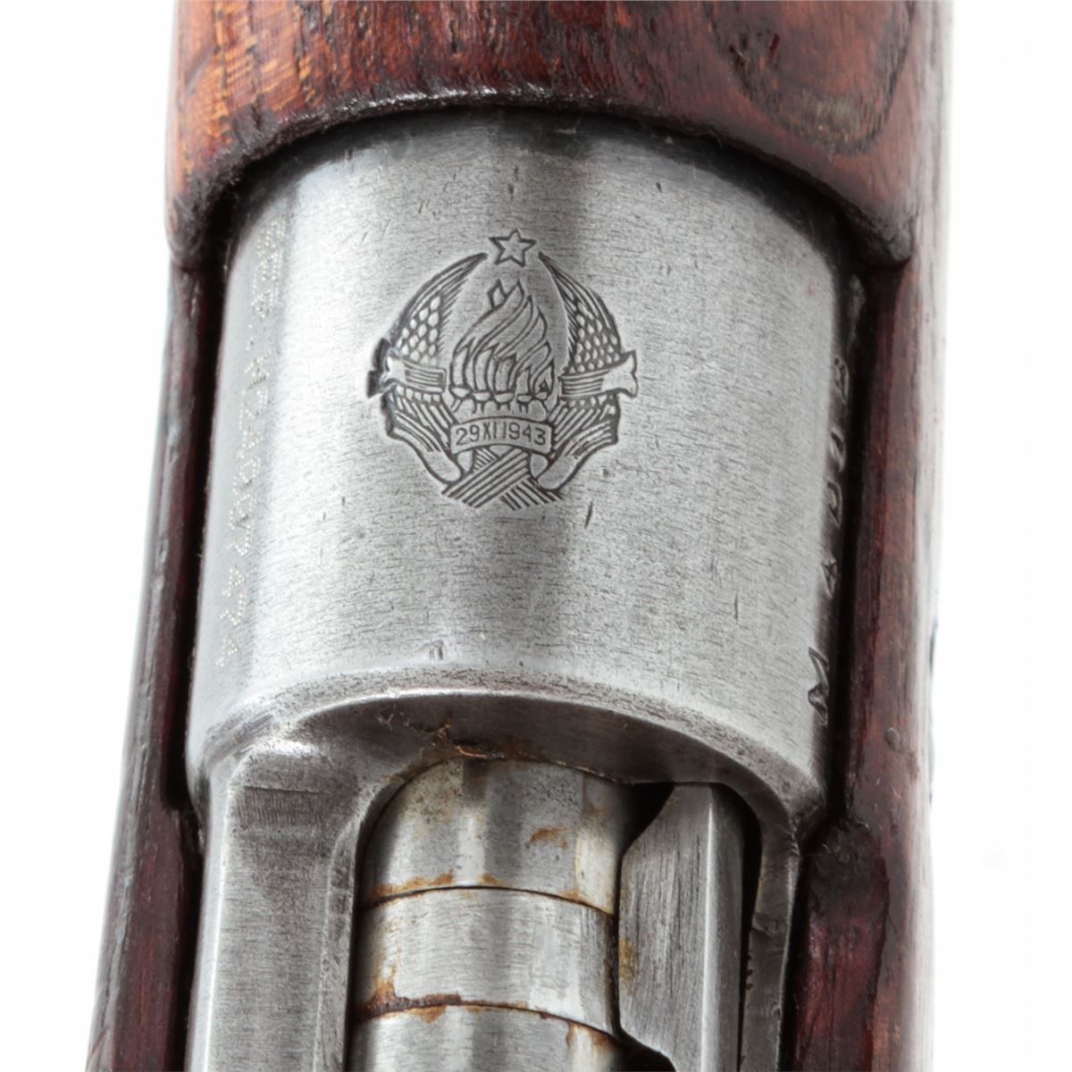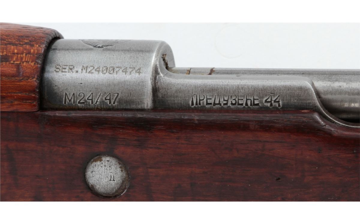 Yugoslavian M24/47 Bolt Action Rifle, #M4018, 8mm, 24'' barrel, blue finish, European walnut stock. Condition is very good retaining approx. 20%-30% original blue. Stock with light scuffs, minor bruises, and some oil darkening. Bolt and stock are matching; triggerguard assembly is not. Rifle is mechanically excellent with crisp action and bright bore. Lightly import marked. Est.: $200-$400. (C&R)