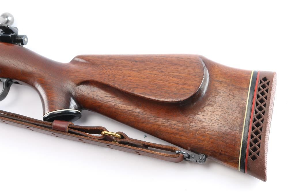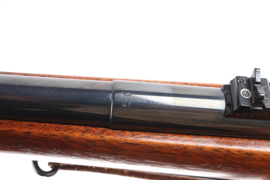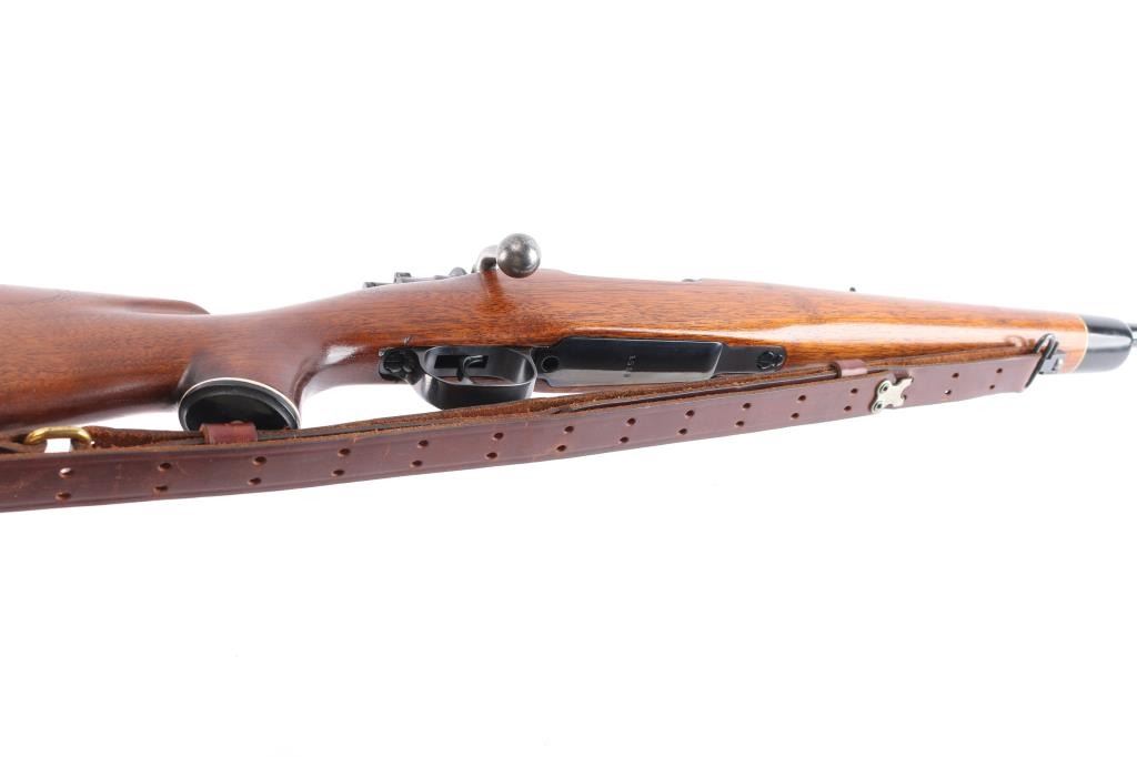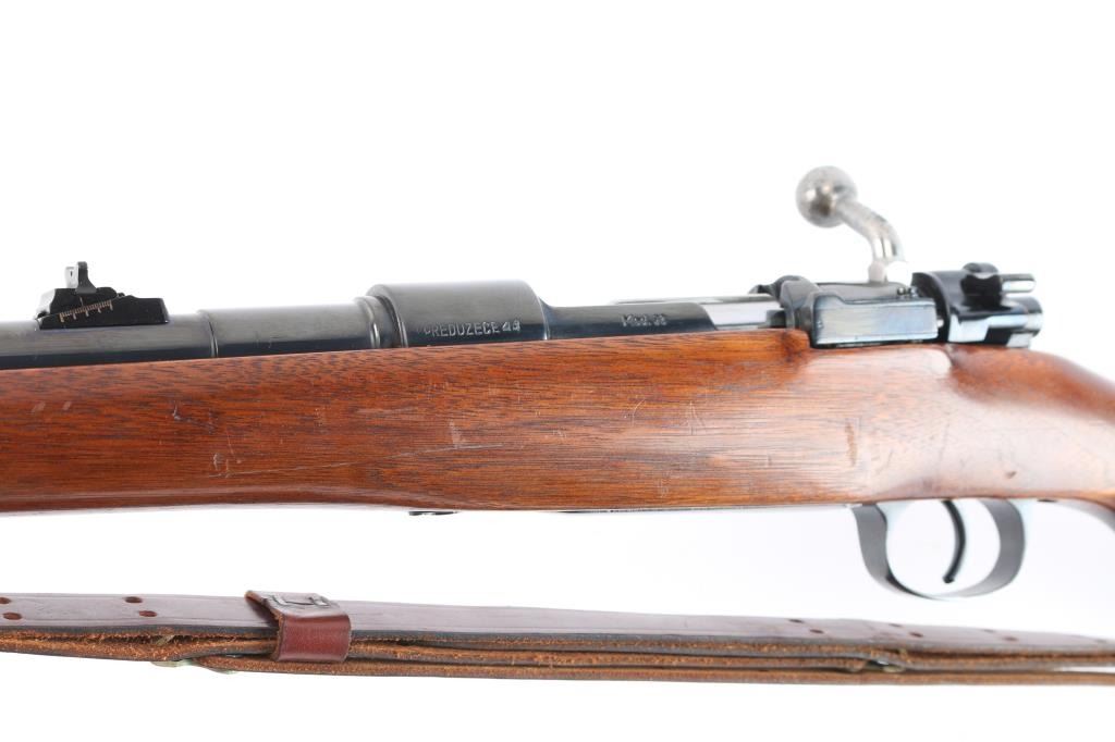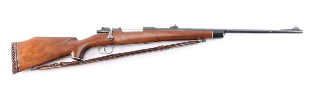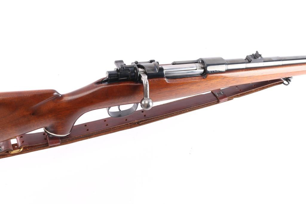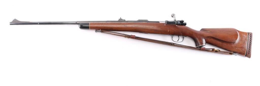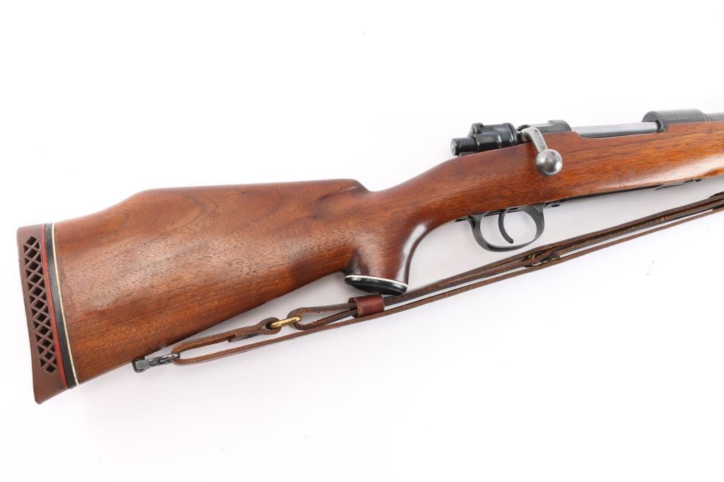 "Yugoslavian Model 98 military mauser rifle that has been sporterized. Refurbished German Karabiner 98k (K98k) rifle, re-worked in Yugoslavia after World War II. "Preduzece 44" (Factory 44) marking on left receiver rail ,Yugoslavian communist crest on chamber has been scrubbed. Reblued finish, 24" barrel with raised blade/bead front sight, Williams adjustable u-notch rear sight. Nice Monte-Carlo style smooth sporting stock with black fore cap, grip cap with white spacers, vented rubber recoil pad., high comb with right-hand cheek rest. Matching serial numbers on receiver, bolt and floorplate. Bore is good, strong rifling, light frosting in the grooves, reblue is about 97% with minor scratches, handling wear and the wood is near excellent.