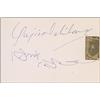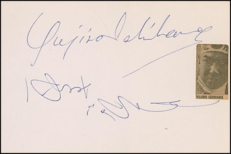 Beloved Japanese actor and singer (1934–1987), referred to as the ‘Japanese Elvis Presley.’ Ballpoint signature, “Yujiro Ishihara,” on an off-white 6 x 4 card, with a small clipped photo affixed to right edge, and adding a small notation under his signature. In fine condition.