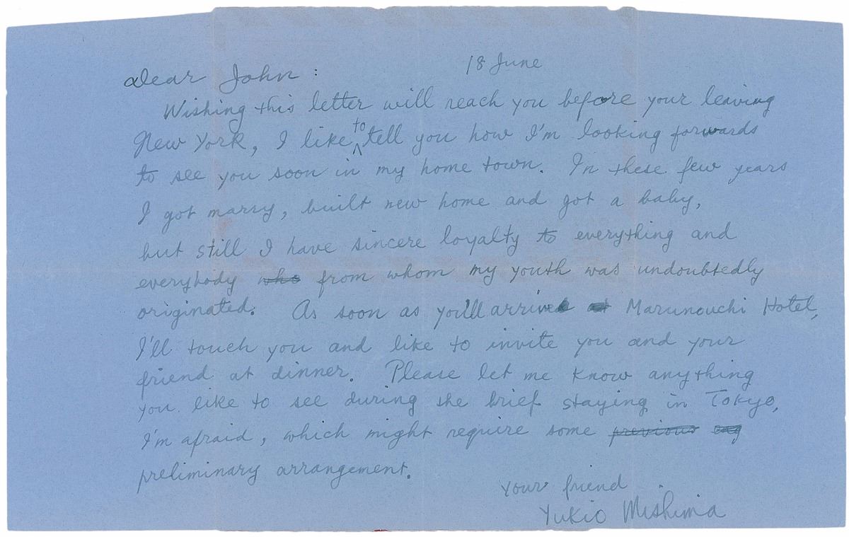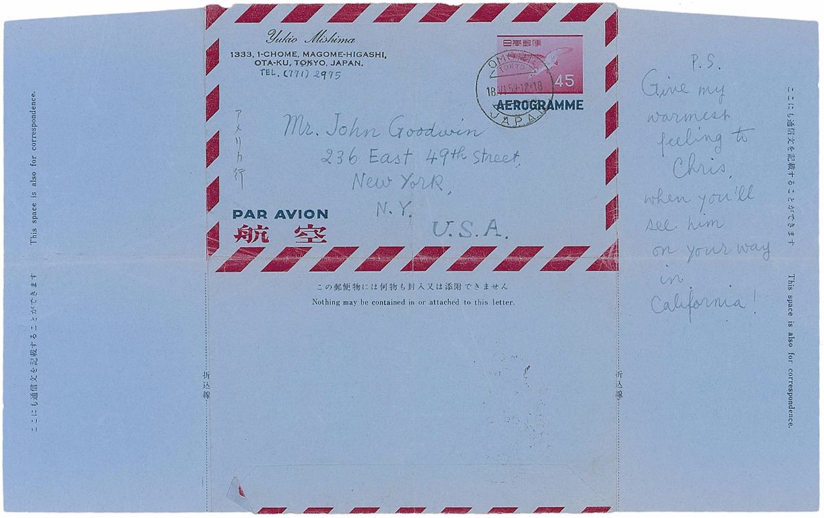 Born in 1912, John Goodwin was a wealthy novelist, poet, painter, and world traveler who shared several acquaintances with Mishima—most notably the novelist Christopher Isherwood, likely the “Chris” mentioned in this letter’s postscript. Encouraging his friend’s visit to Tokyo, Mishima shares the news of his marriage and new baby, born just two weeks prior to this letter. Despite their happy marriage, widespread rumors of homosexuality plagued the author’s wife; extending such welcoming invitations to his numerous literary friends in the gay community, including Goodwin, only contributed to the gossip. A scarce and interesting letter touching on one of the key issues in the biography of this famously controversial writer.