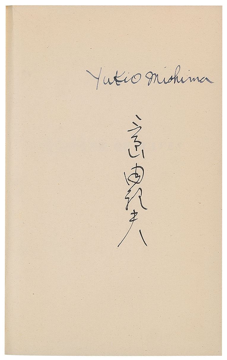Japanese author (1925–1970) whose works remain some of the most significant of the 20th century; he committed ritual suicide to protest the Westernization and military weakness of postwar Japan. Signed book: The Sound of Waves. First UK edition. London: Secker & Warburg, 1957. Hardcover with dust jacket, 5.25 x 8, 183 pages. Signed on an opening page in black ink by Yukio Mishima, who signs his name below in Japanese characters.
