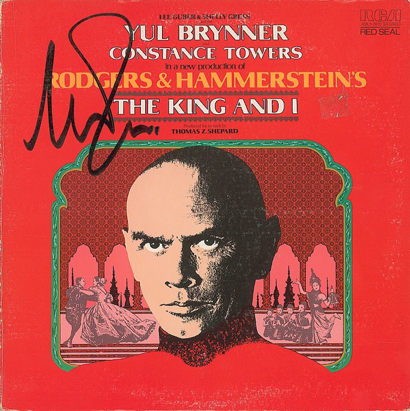 The King and I sountrack album signed on the front cover in black felt tip. In very good condition, with mild ‘ring of wear’ to both covers, adhesive residue from a removed price tag, and a small separation along top edge. The record is included.