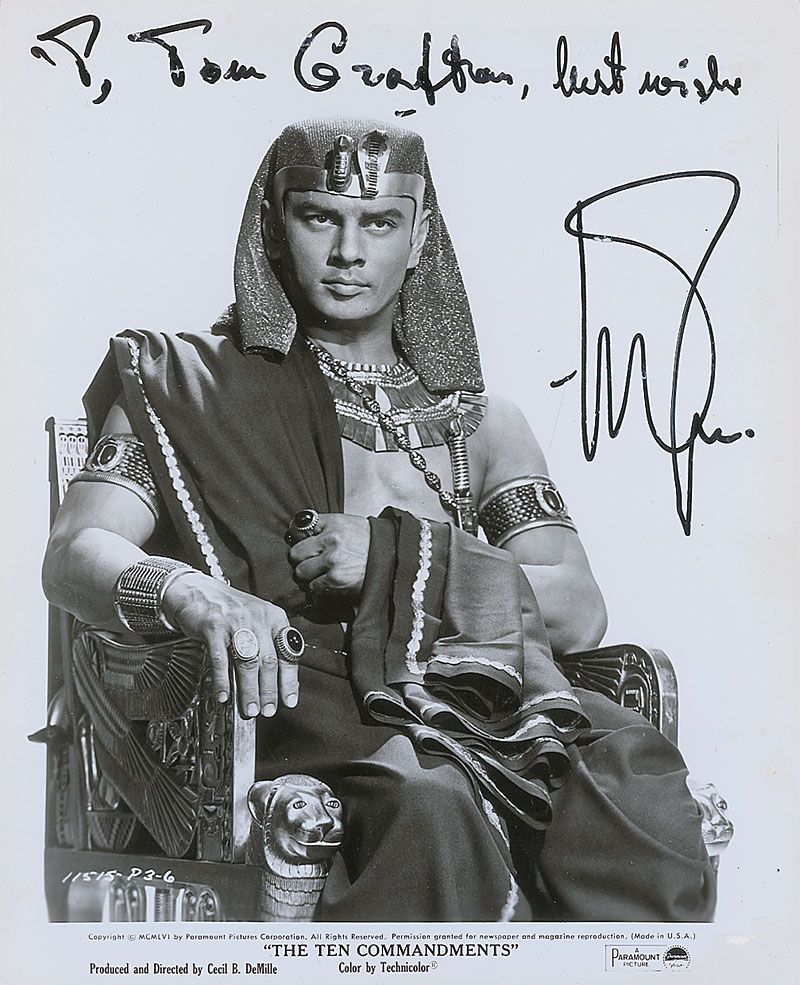 Glossy 8 x 10 Paramount promotional photo for The Ten Commandments, signed and inscribed in black felt tip, “To Tom Grafton, best wishes, Yul Brynner.” A few corner creases, some toning along right edge, and a bit of irregular adhesion to portions of inscription, otherwise fine condition.