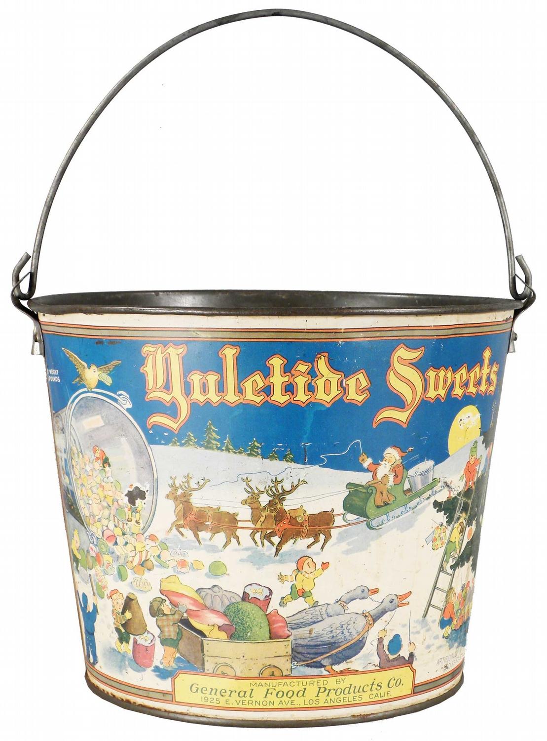 Yuletide Sweets 10 lb. Tin Candy Bucket w/bale. Christmas motif on all sides. Some very minor rubs and paint loss otherwise very good condition. 10 1/4 inch diameter at top and 8 inches tall.